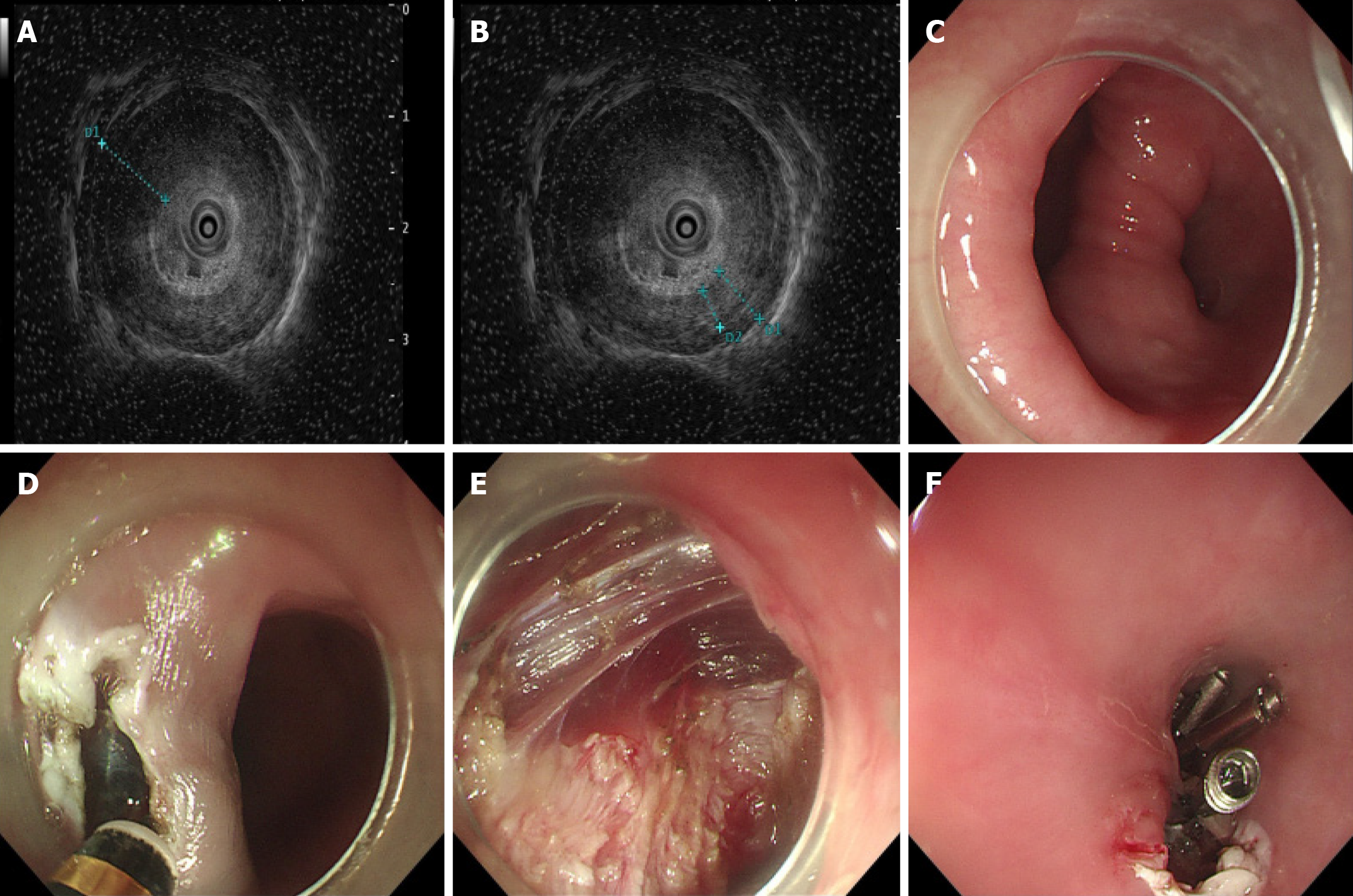 A and B: Ultrasonic gastroscopy of the layers of the diverticulum; C: Giant esophageal diverticulum; D: Construction of the tunnel; E: Incision of the muscle; F: Closure of the wound with titanium clips.