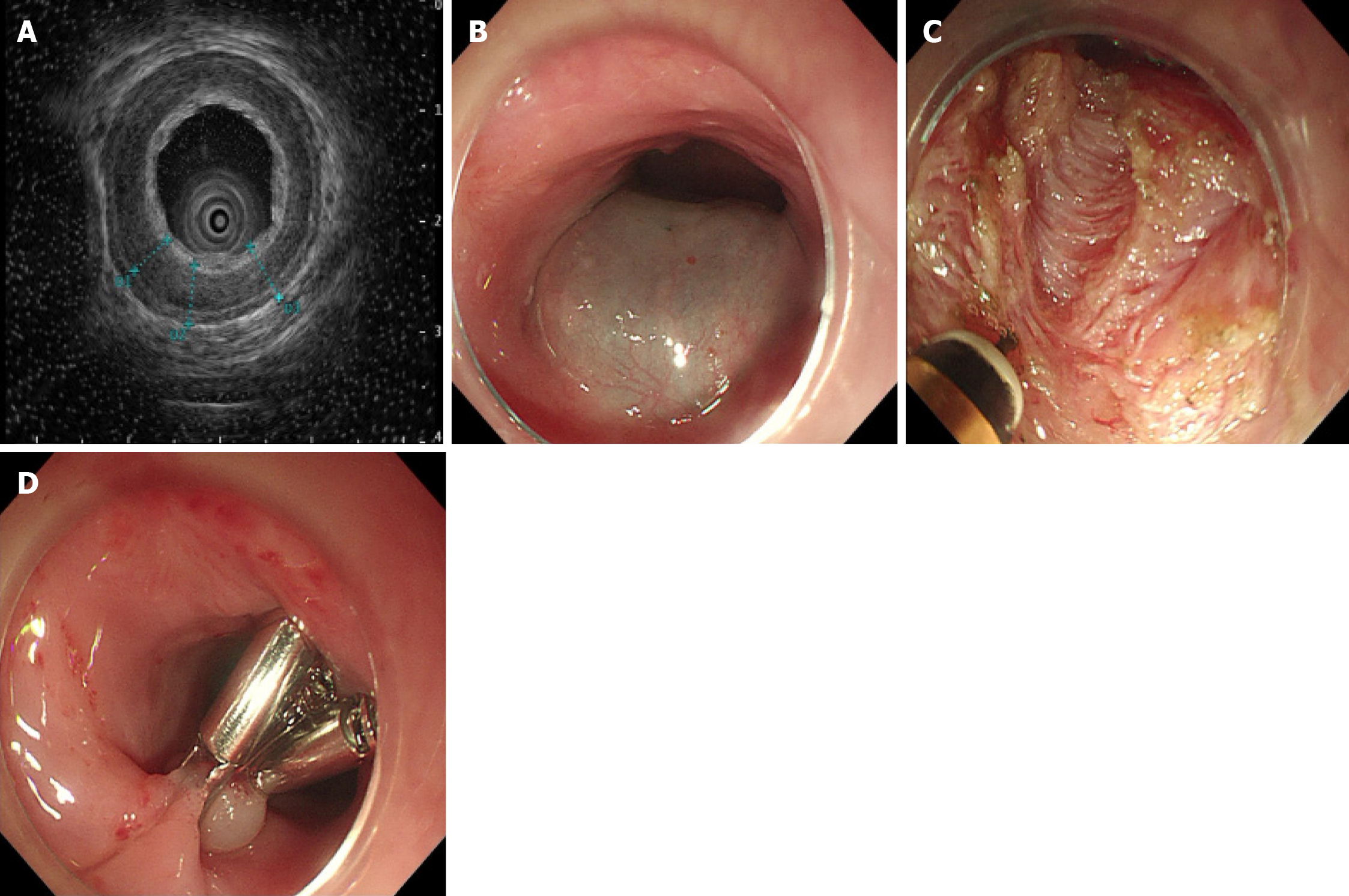 A: Ultrasonic gastroscopy of the layers of the esophagus; B: Construction of a tunnel; C: Incision of the muscle; D: Closure of the wound with titanium clips.