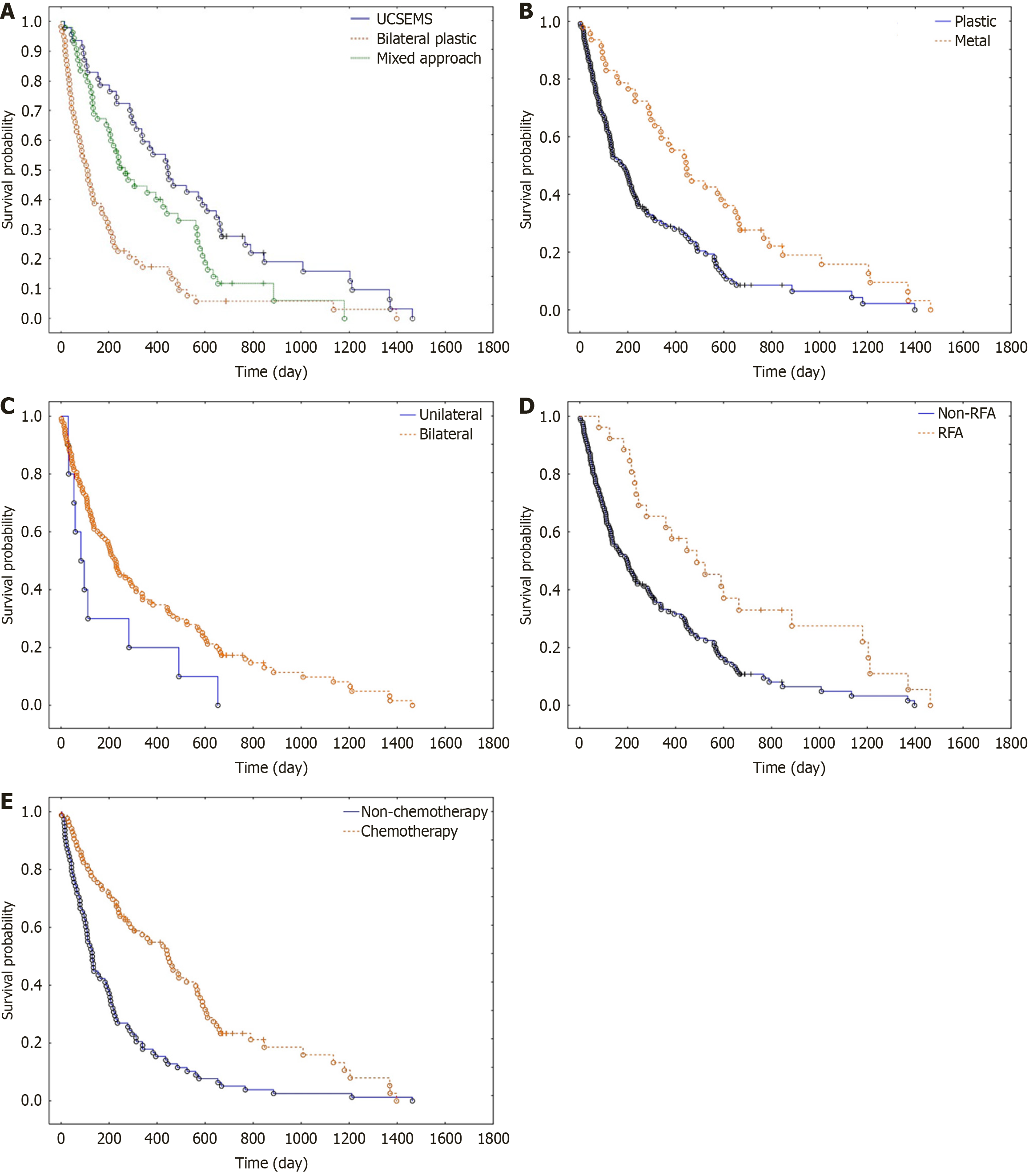 A: Kaplan-Meier curve comparing overall survival (OS) among the 4 groups; B-D: Kaplan-Meier curve comparing OS among the 2 groups plastic and metal stents (B), unilateral and bilateral (C) and patients undergoing radiofrequency ablation (RFA) and non-RFA (D); E: Kaplan-Meier curves of patients treated with endoscopy and chemotherapy and endoscopy only. UCSEMS: Uncovered self-expandable metal stents; RFA: Radiofrequency ablation.