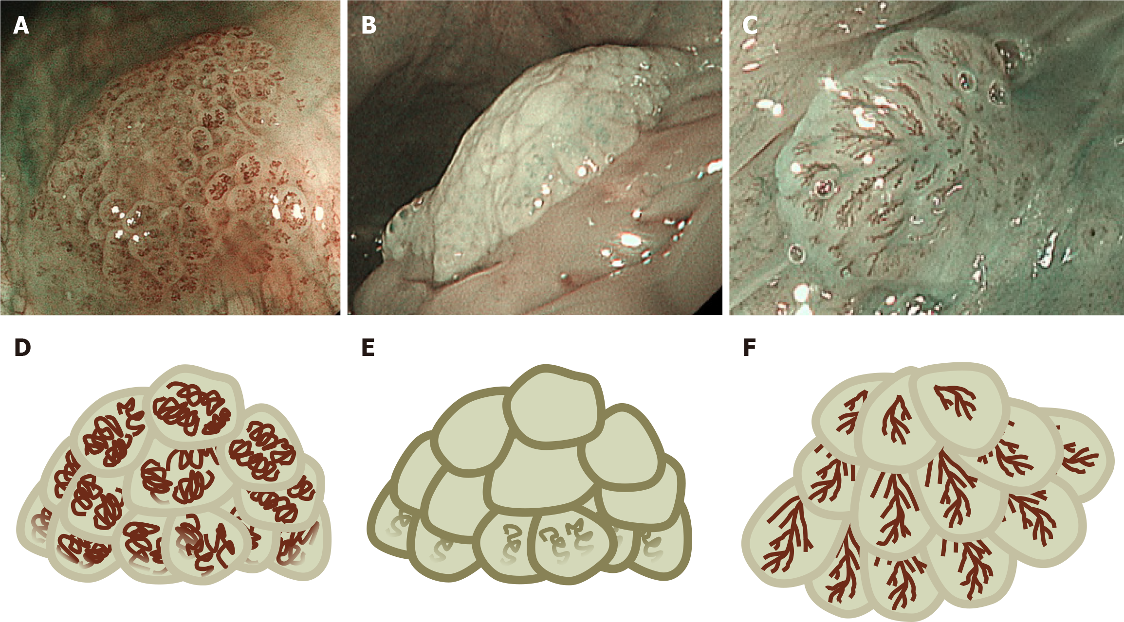 A-C: Typical endoscopic images of oral and pharyngolaryngeal papillomas; D-F: Their corresponding schema. We classified oral and pharyngolaryngeal papillomas into three distinct patterns based on endoscopic features. A and D: Salmon roe-like polyp is an elevated lesion with aggregation of multiple small nodules. Coil-shaped capillaries are internally visible in each nodule, resembling salmon roe or frog eggs; B and E: A polyp without capillary transparency is similar to the previous type of polyp and involves an elevated lesion with aggregation of multiple small nodules. However, there is no capillary transparency or only slightly visible capillaries; C and F: Pinecone-like polyp resembles a pinecone. This type of polyp consists of overlapping scale-like components, and capillaries resembling leaf veins are visible in each element.