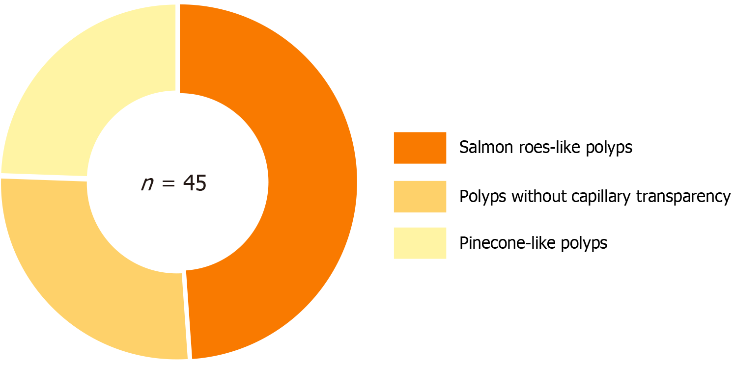 The 45 papilloma lesions consisted of salmon roe-like polyps (n = 22), polyps without capillary transparency (n = 12), and pinecone-like polyps (n = 11).