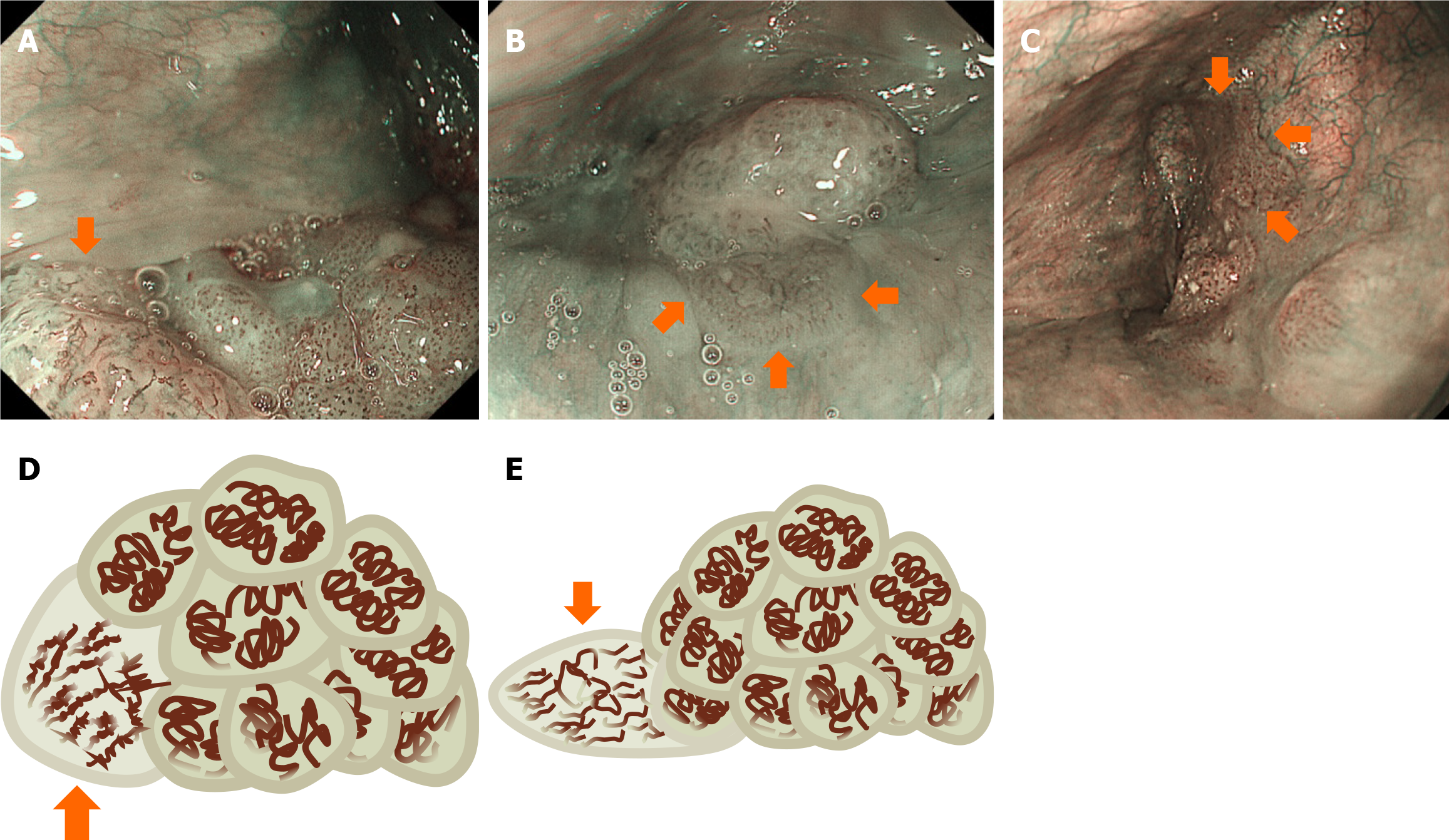 A-C: Typical endoscopic images; D and E: The schema. A and D: In a squamous cell carcinoma lesion, an uneven, lobulated structure and irregular morphology of capillaries are observed (arrow); B and E: Coexistence of a flat lesion is evident within a squamous cell carcinoma (arrows). The lobulated structure is absent, and the morphology of the capillaries is irregular in the flat lesion; C: Another squamous cell carcinoma accompanies a flat lesion without a lobulated structure (arrows).