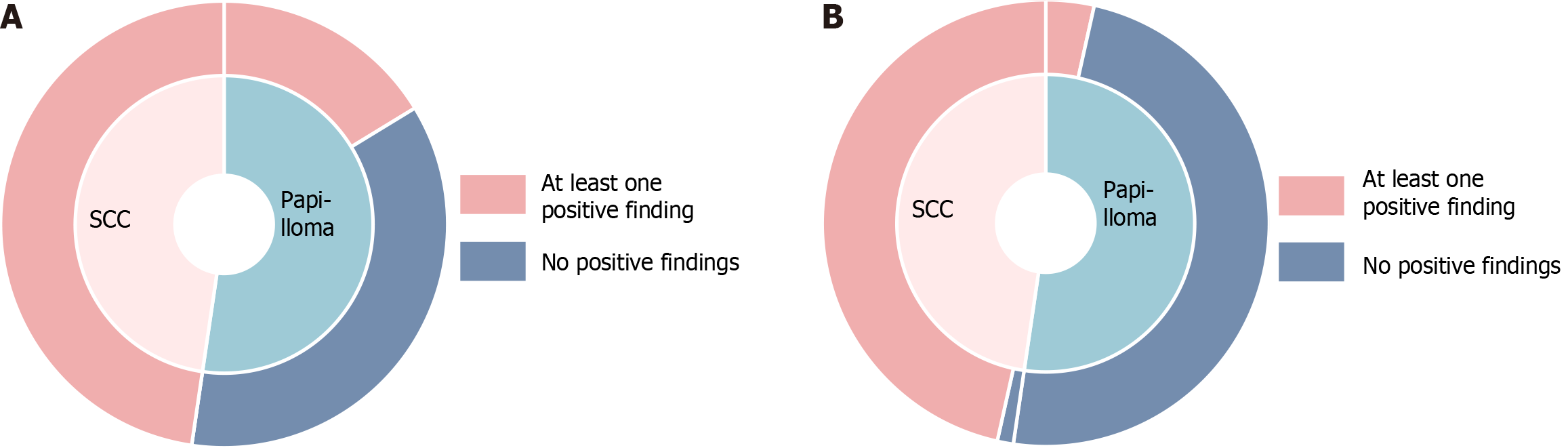 Figure 4 Positivity rates of findings for diagnosing squamous cell carcinoma and papillomas in donut plots.