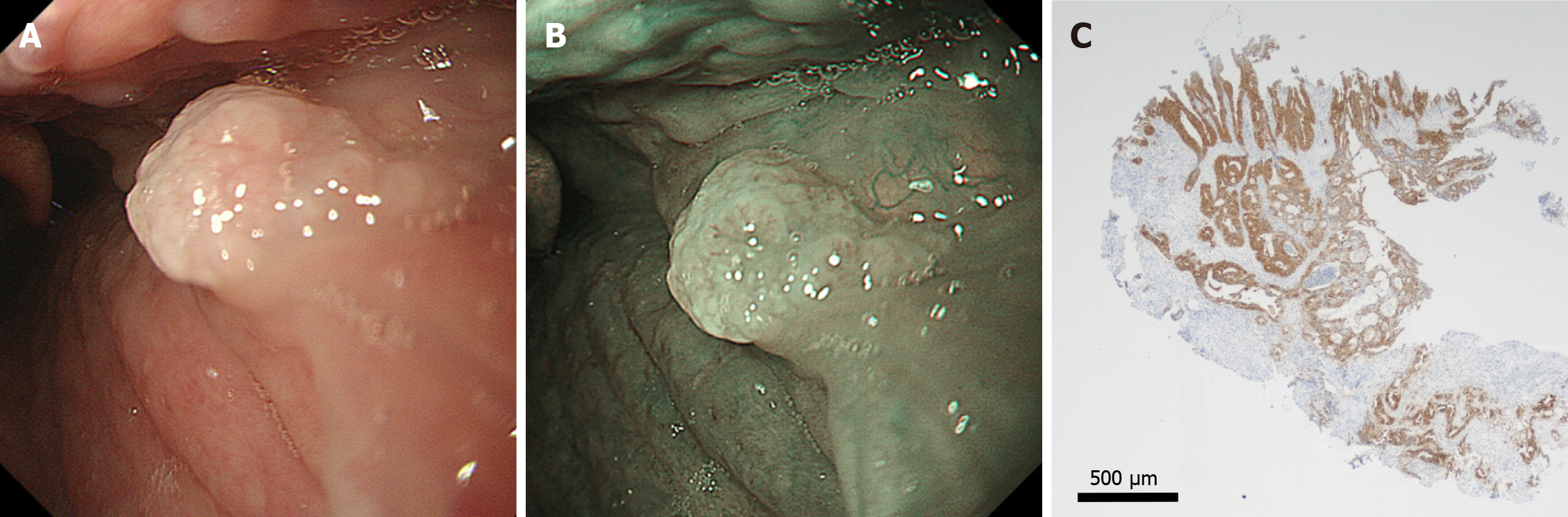 A and B: Regarding immunostaining for p16, a pharyngeal papilloma in a 55-year-old male presents as a polyp without capillary transparency (A: White light; B: Narrow band imaging); C: This lesion exhibits positive p16 staining. The remaining 44 cases all tested negative for p16 staining.