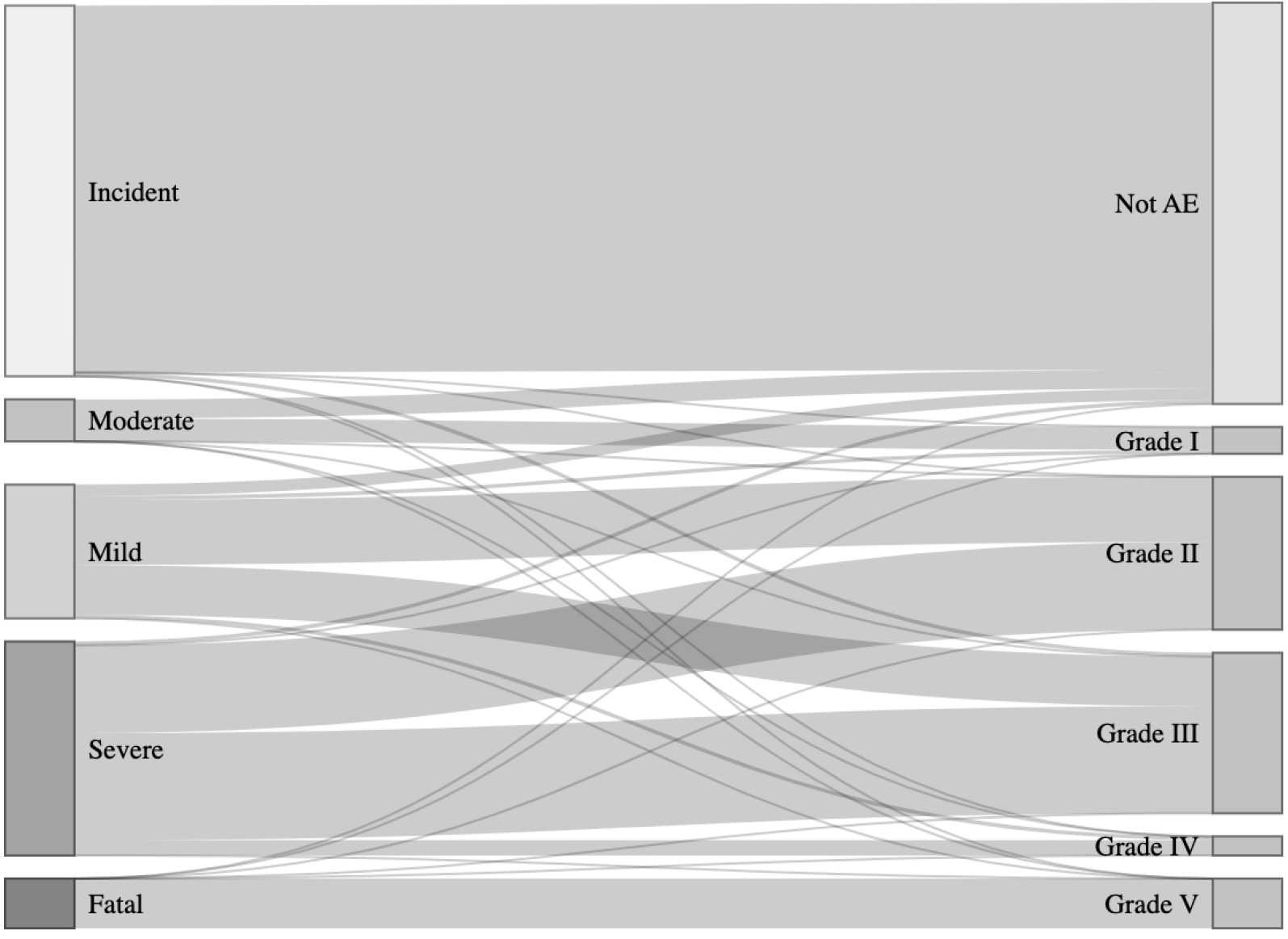 Figure 2 Sankey diagram showing distribution of adverse events according to the American Society for Gastrointestinal Endoscopy (left) and adverse events in gastrointestinal endoscopy (right) classifications.