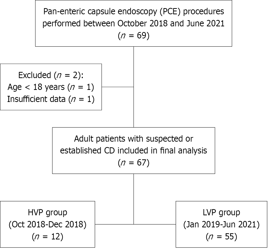Between October 2018 and June 2021, 69 patients underwent pan-enteric capsule endoscopy. Two were excluded, leaving 67 adults with suspected or established Crohn’s disease. Initially, 12 patients were examined using a high-volume preparation (October 2018 to December 2018). Thereafter, the protocol was replaced by a low-volume preparation, applied in 55 patients (January 2019 to June 2021). PCE: Pan-enteric capsule endoscopy; CD: Crohn’s disease; LVP: Low-volume protocol; HVP: High-volume protocol.