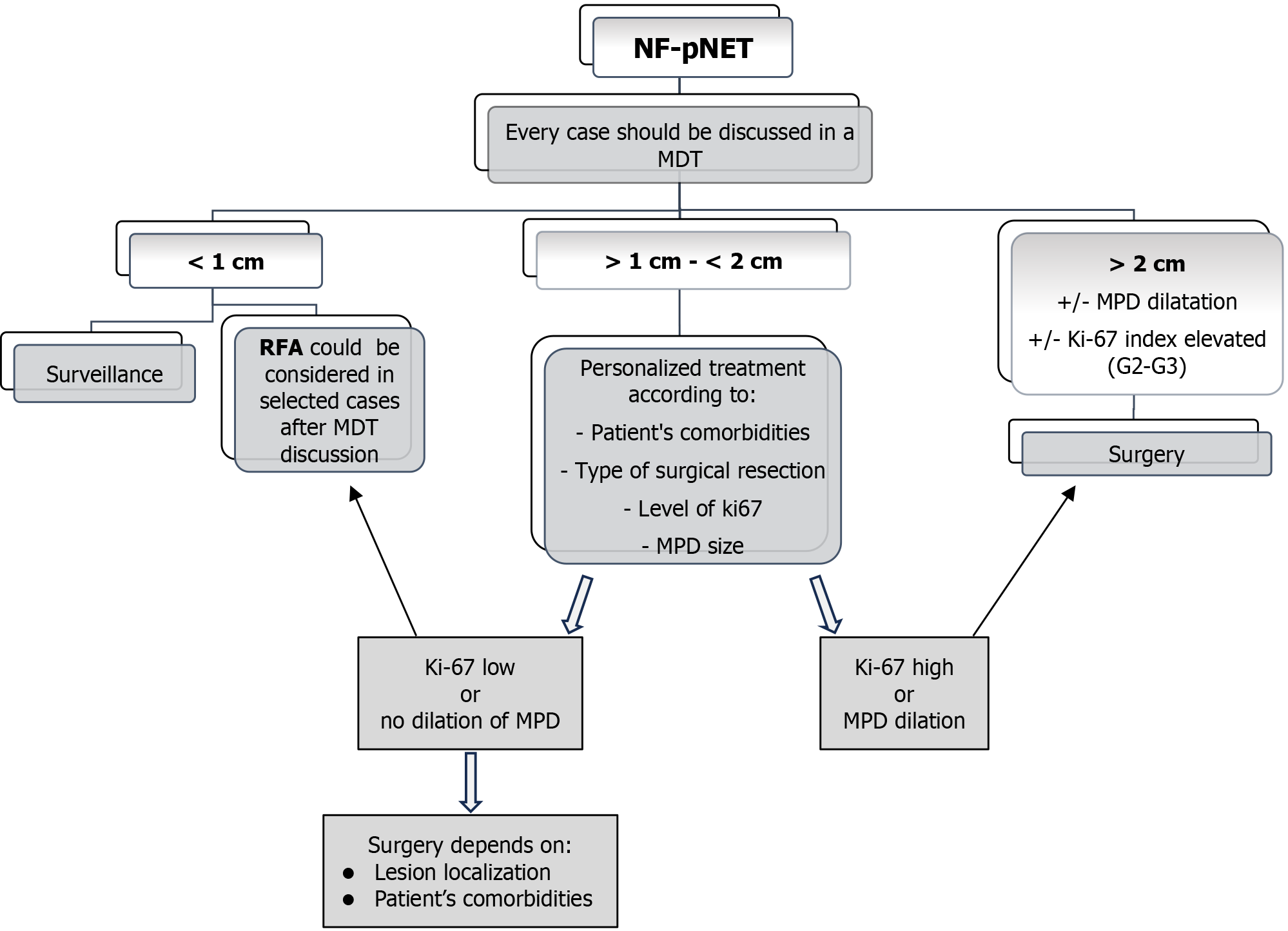 NF-pNET: Non-functioning-pancreatic neuroendocrine tumors; RFA: Radiofrequency ablation; MDT: Multidisciplinary team; MPD: Main pancreatic duct; G: Grade.