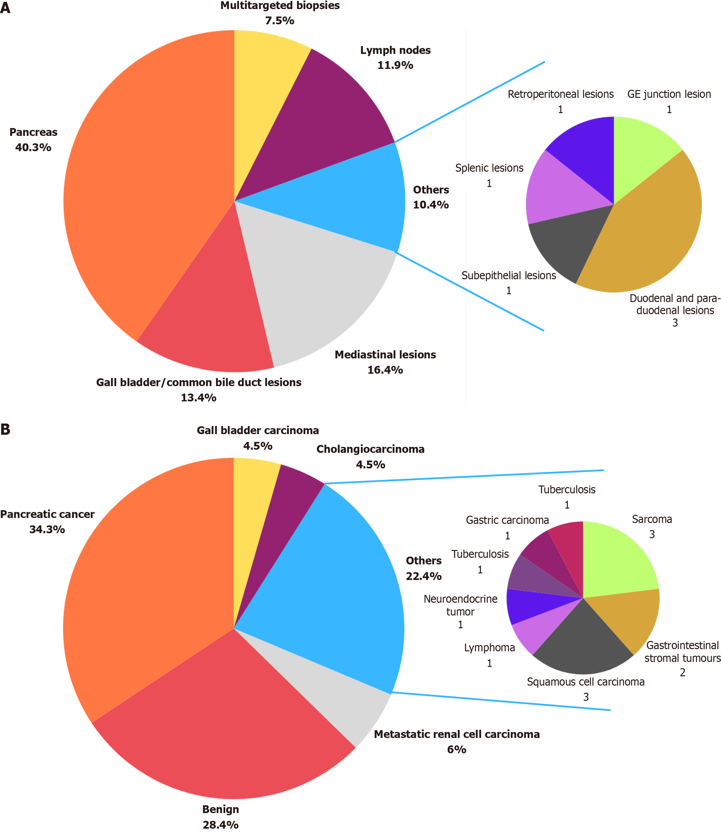 A: Distribution of biopsy specimens for endoscopic ultrasound-guided fine needle biopsy (EUS-FNB); B: Definitive tissue diagnoses obtained through EUS-FNB based on histopathological analysis. GE: Gastroesophageal.
