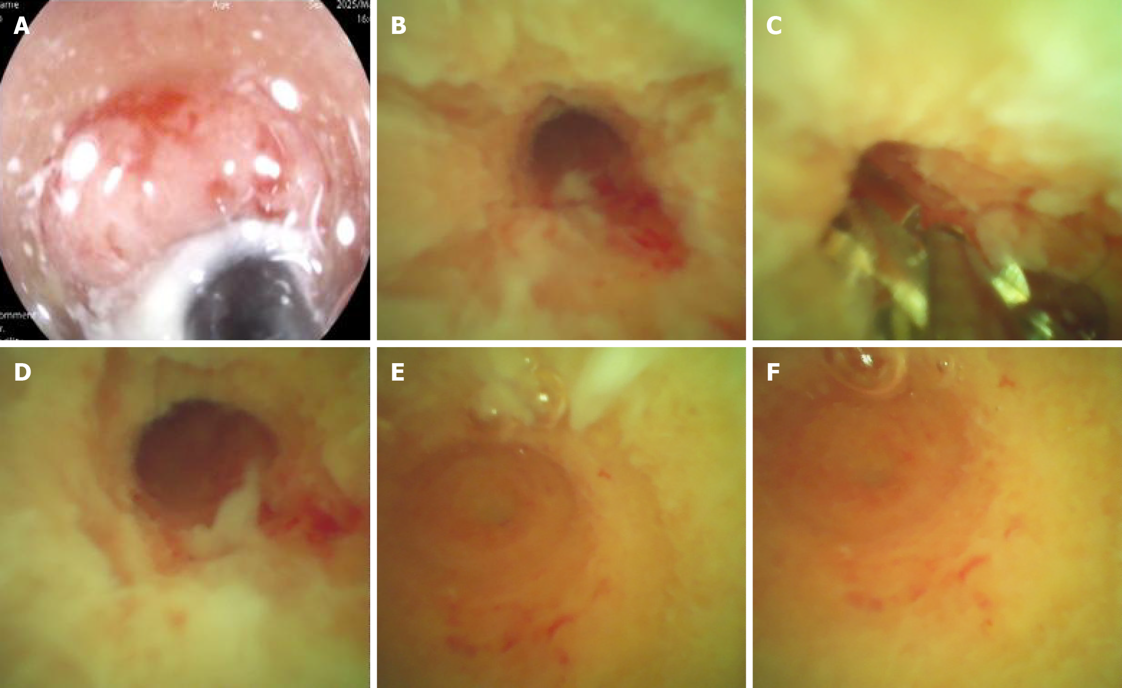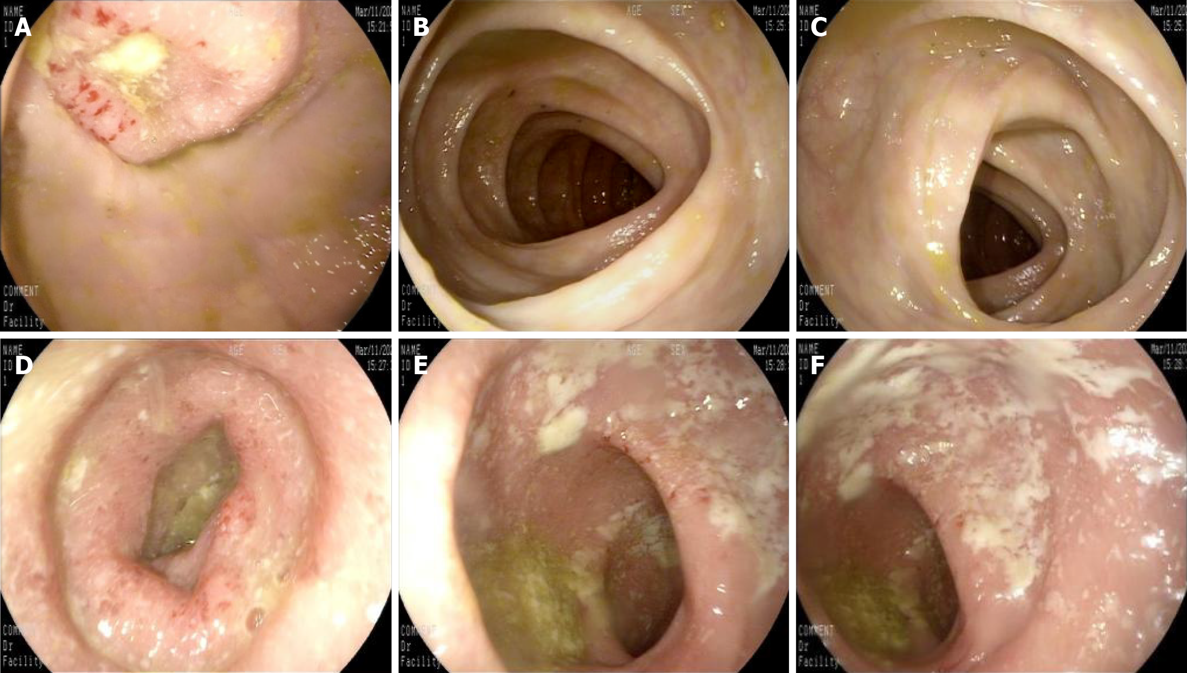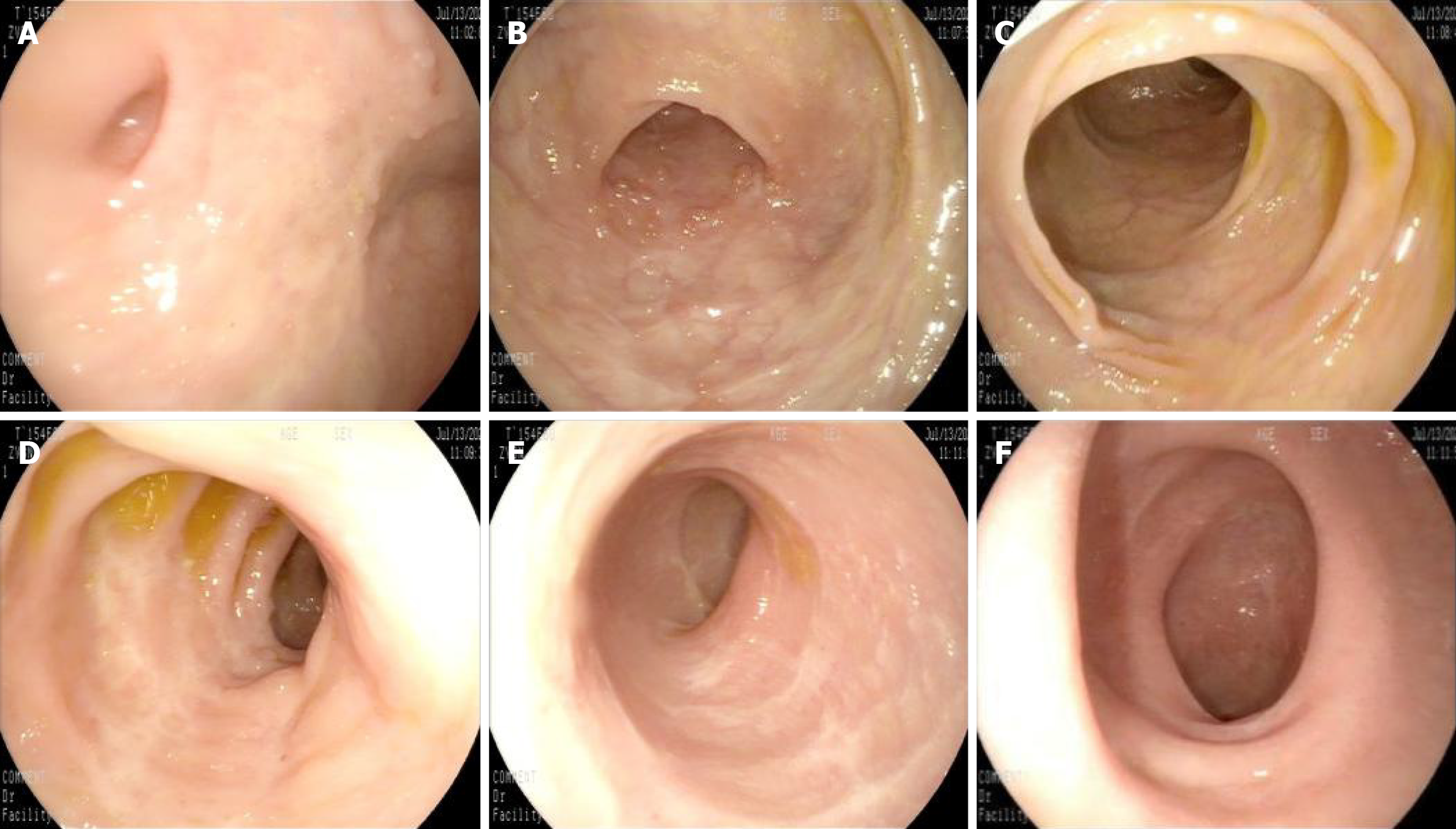 A: Appendiceal orifice, normal appendiceal orifice and surrounding mucosa; B: Ascending colon, mucosa appeared normal; C: Transverse colon, mucosa appeared normal; D: Descending colon, mucosa appeared normal; E: The sigmoid colon mucosa showed ulcer scars, indicating healing; F: The rectal mucosa similarly exhibited ulcer scars, consistent with mucosal healing.