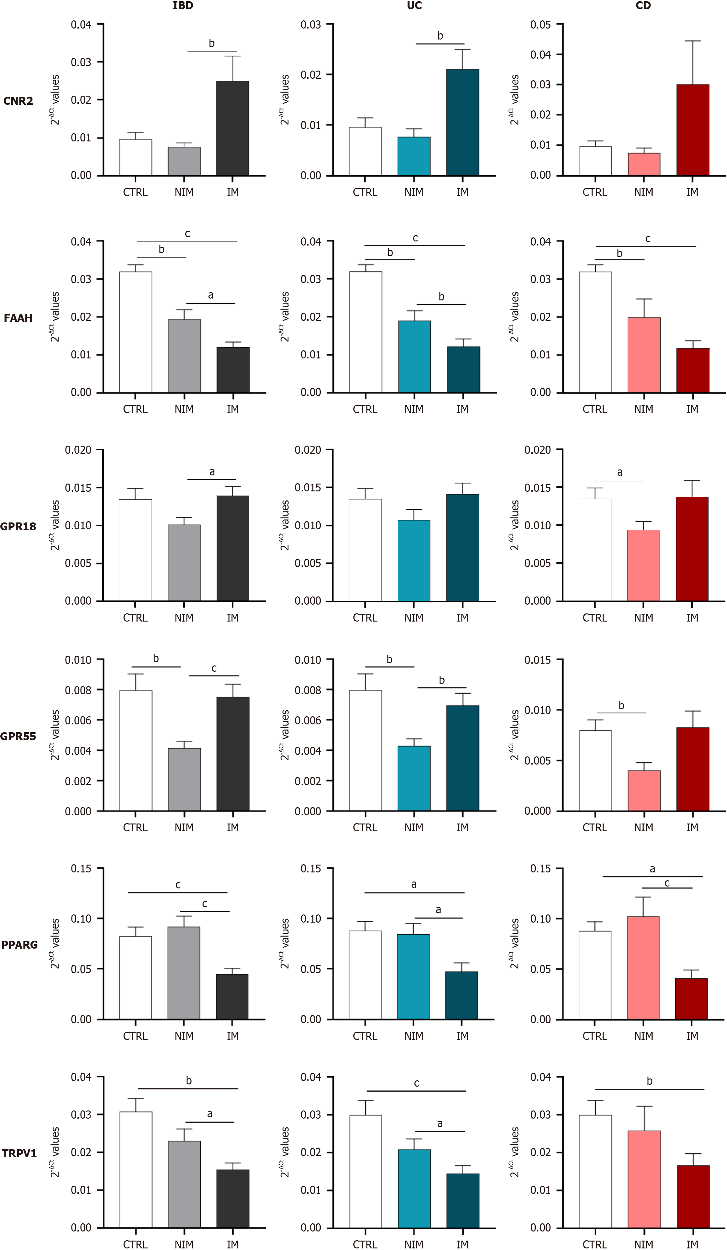 Bar graphs refer to the mean of the 2-ΔCt values in each group, and error bars represent the SEM. aP < 0.05, bP < 0.01, cP < 0.001. IBD: Inflammatory bowel disease; UC: Ulcerative colitis; CD: Crohn’s disease; CTRL: Non-inflammatory bowel disease controls; NIM: Noninflamed mucosa, IM: Inflamed mucosa; CNR2: Cannabinoid receptor 2; FAAH: Fatty acid amide hydrolase; GPR: G protein-coupled receptor 18; GPR55: G protein-coupled receptor 55; PPARG: Peroxisome proliferator-activated receptor gamma; TRPV1: Transient receptor potential cation channel, subfamily V, member 1.