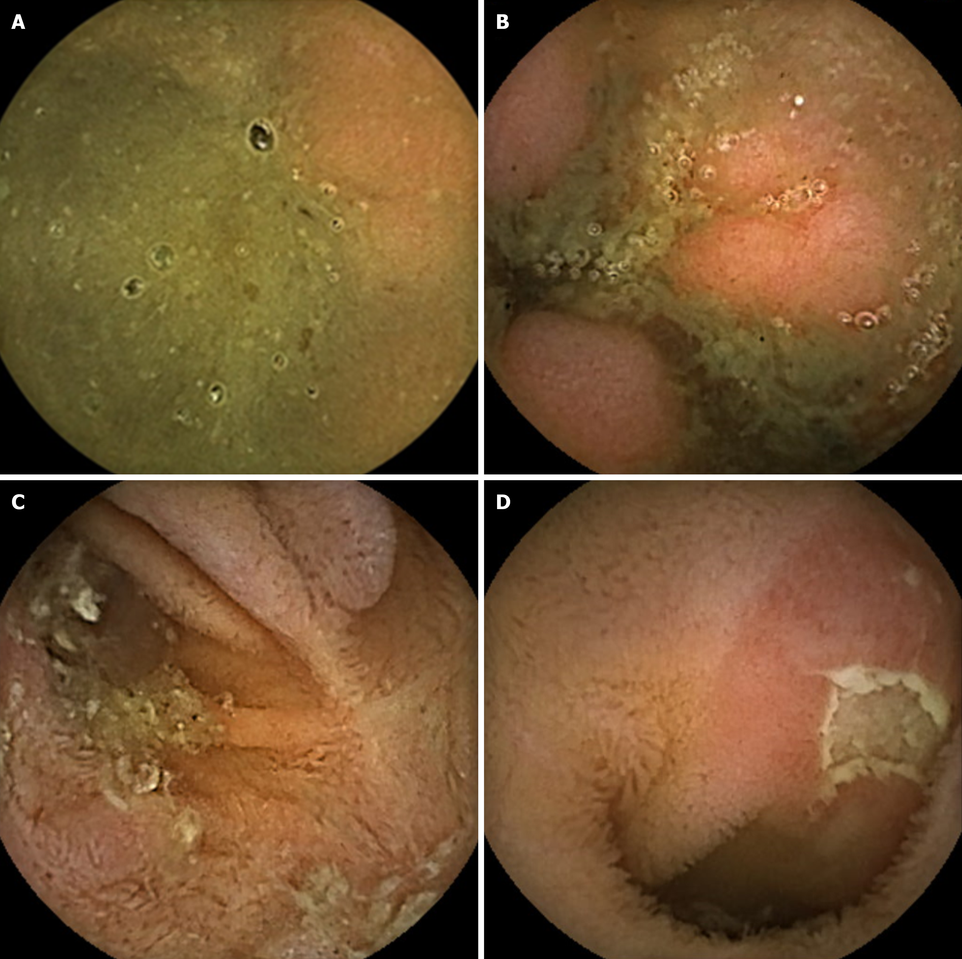 A: Poor, 1 point. A large amount of fecal residue precludes a complete examination; B: Fair, 2 points. Inadequate, but examination completed. Enough feces or turbid fluid present to prevent a reliable examination; C: Good, 3 points. Small amount of feces or turbid fluid not interfering with examination; D: Excellent, 4 points. No more than small bits of adherent feces.