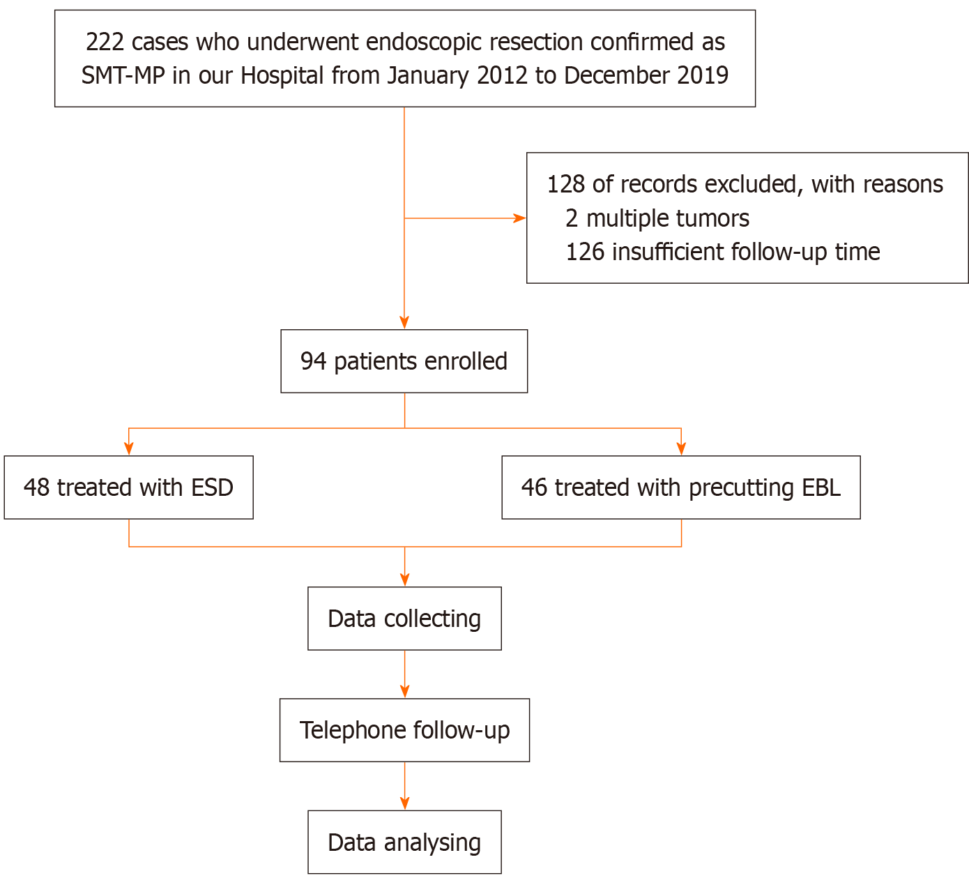 SMT-MP: Submucosal tumors originating from the muscularis propria; ESD: Endoscopic submucosal dissection; EBL: Endoscopic band ligation.