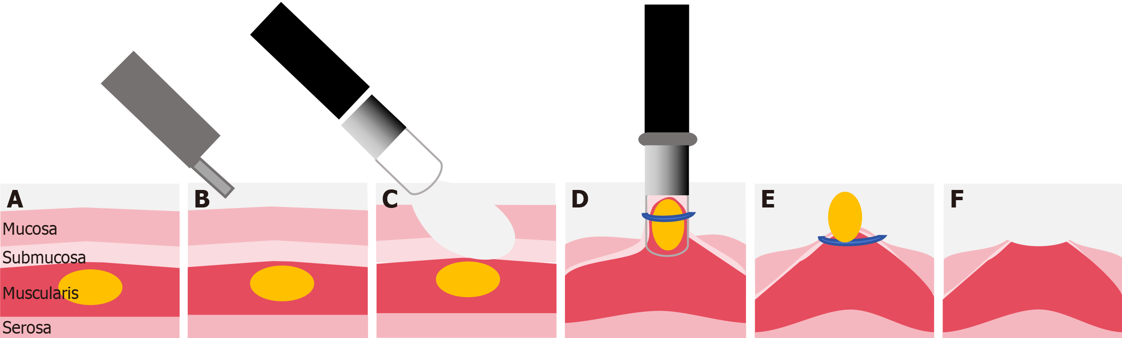 A: Small gastric submucosal tumors originating from the muscularis propria layer; B: A power of 30 watts was used for surgical resection, with precutting and peeling of the mucous membrane; C: The mucosa was denuded from the submucosal lesion, and a transparent ligator cap was attached to the endoscope; D: The exposed tumor was fully aspirated into the cap; E: The band was loosened, and the entire tumor was ligated; F: The tumor was left to fall off due to necrosis, a process that takes about 2-7 days.