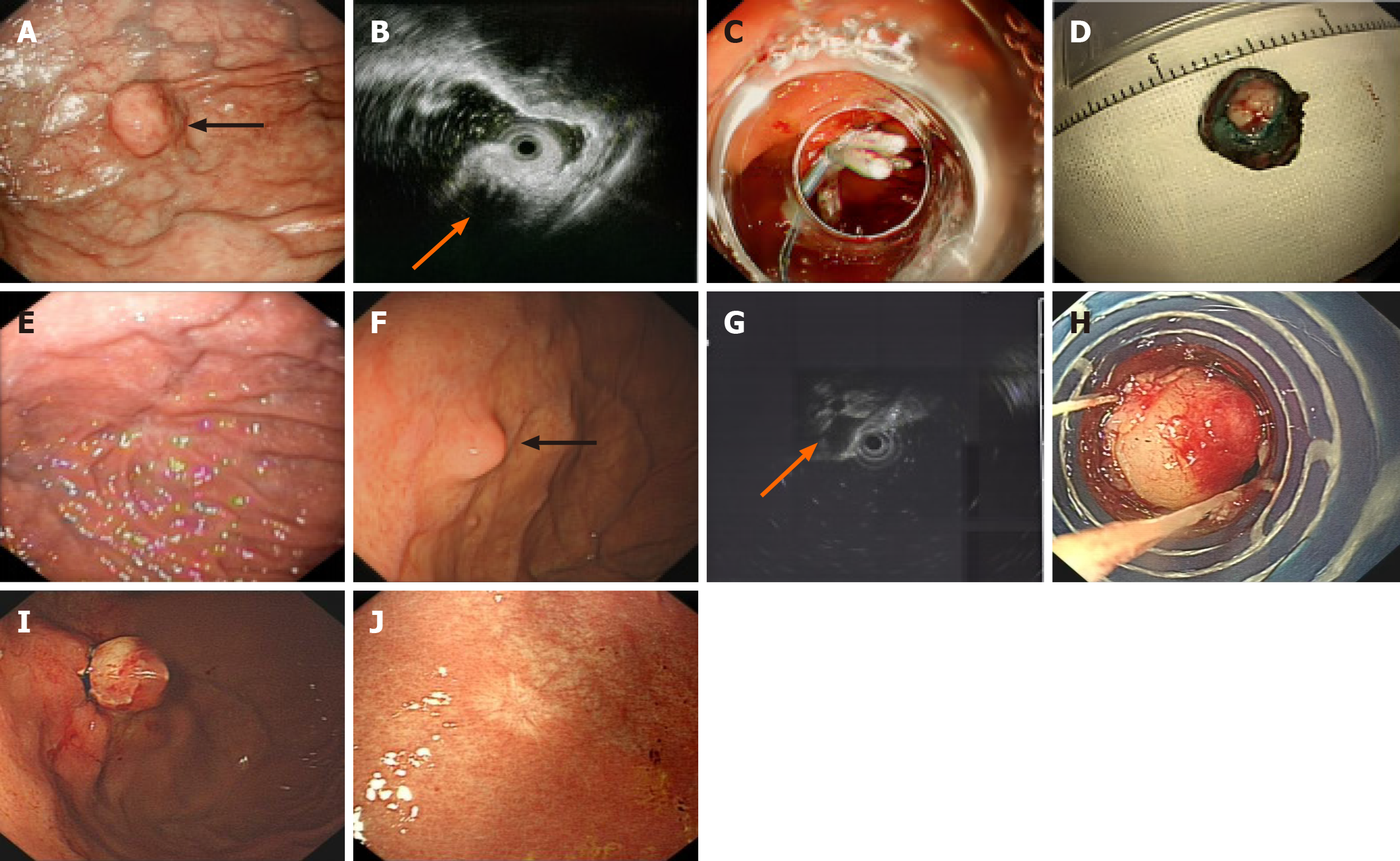 A: Preoperative endoscopic view of submucosal tumors originating from the muscularis propria (black arrow); B: Endoscopic ultrasonography view (orange arrow); C: The “clipping closure” procedure in endoscopic submucosal dissection; D: Specimen resected by endoscopic submucosal dissection; E: Five-year endoscopic follow-up after endoscopic submucosal dissection under standard endoscopy; F: Preoperative endoscopic view (black arrow); G: A hypoechoic submucosal tumors originating from the muscularis propria in the gastric fundus (orange arrow) detected by endoscopic ultrasonography; H: The exposed tumor was fully aspirated into the cap; I: The exposed tumor was ligated by band ligation; J: Endoscopic follow-up.