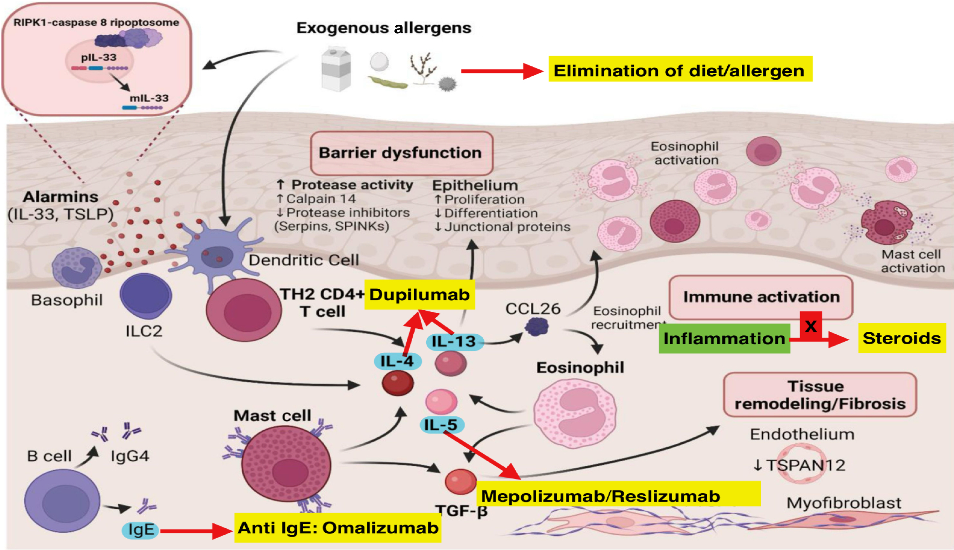Food and aeroallergens act as triggers. Altered epithelial integrity helps increase antigen exposure to antigen-presenting cells that starts a type 2 helper T cell-mediated inflammatory cascade. This causes tissue inflammation and damage. Activation of transforming growth factor-beta leads to fibrosis and tissue remodeling. Various group of drugs have been depicted, targeting specific target molecules along the proinflammatory cascade. CCL26: Chemokine (C-C motif) ligand 26; Ig: Immunoglobulin; IL: Interleukin; ILC2: Innate lymphoid cell 2; TGF-β: Transforming growth factor beta; TSLP: Thymic stromal lymphopoietin; TSPAN: Tetraspanin; pIL-33: Plasmin interleukin 33; mIL-33: Murine interleukin 33; RIPK1: Receptor interacting serine/threonine protein kinase 1; SPINK: Serine protease inhibitor Kazal; TH2: T helper 2; CD4: Cluster of differentiation 4.