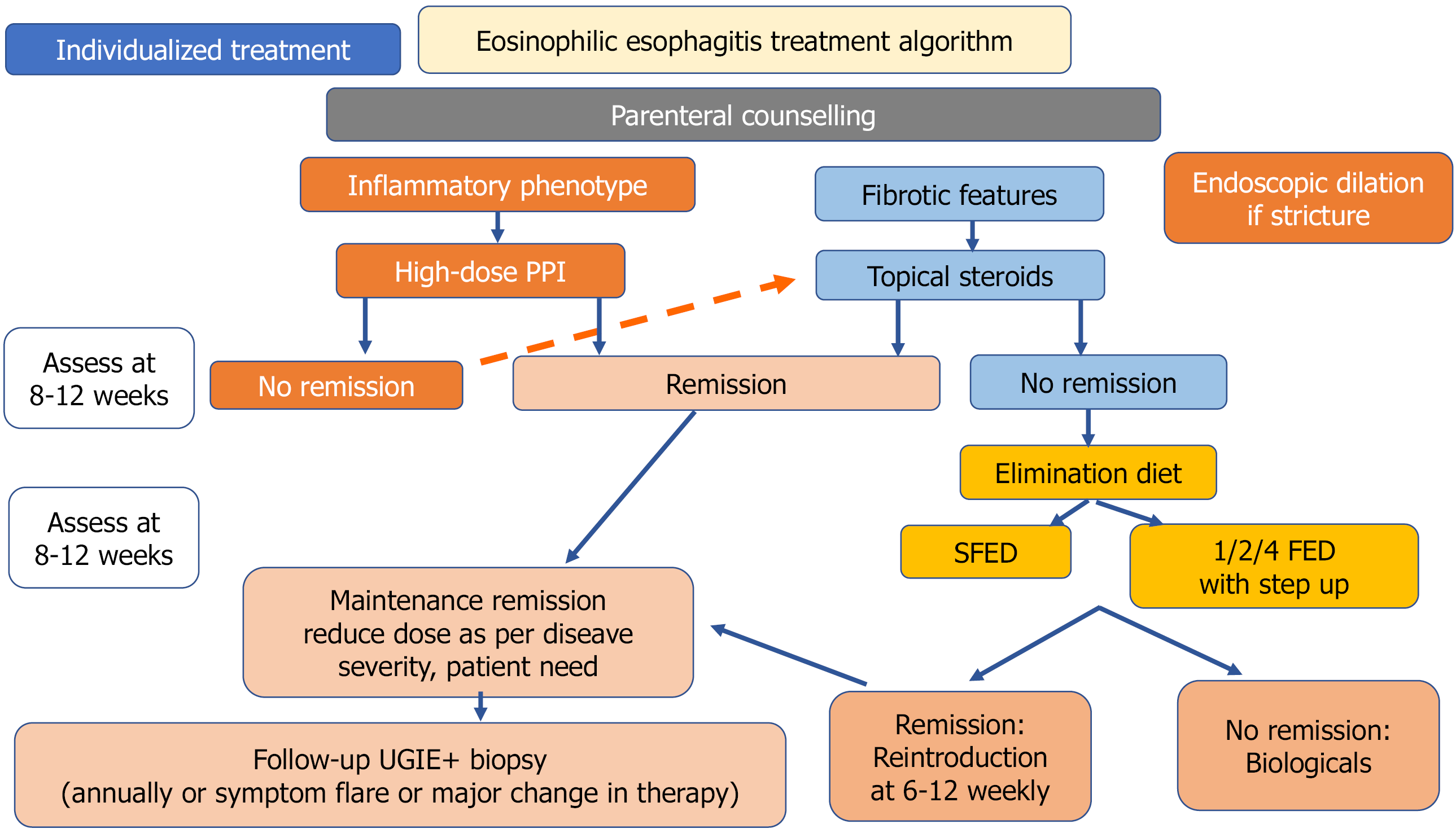 FED: Food elimination diet; PPI: Proton pump inhibitor; SFED: Six-food elimination diet; UGIE: Upper gastrointestinal endoscopy.