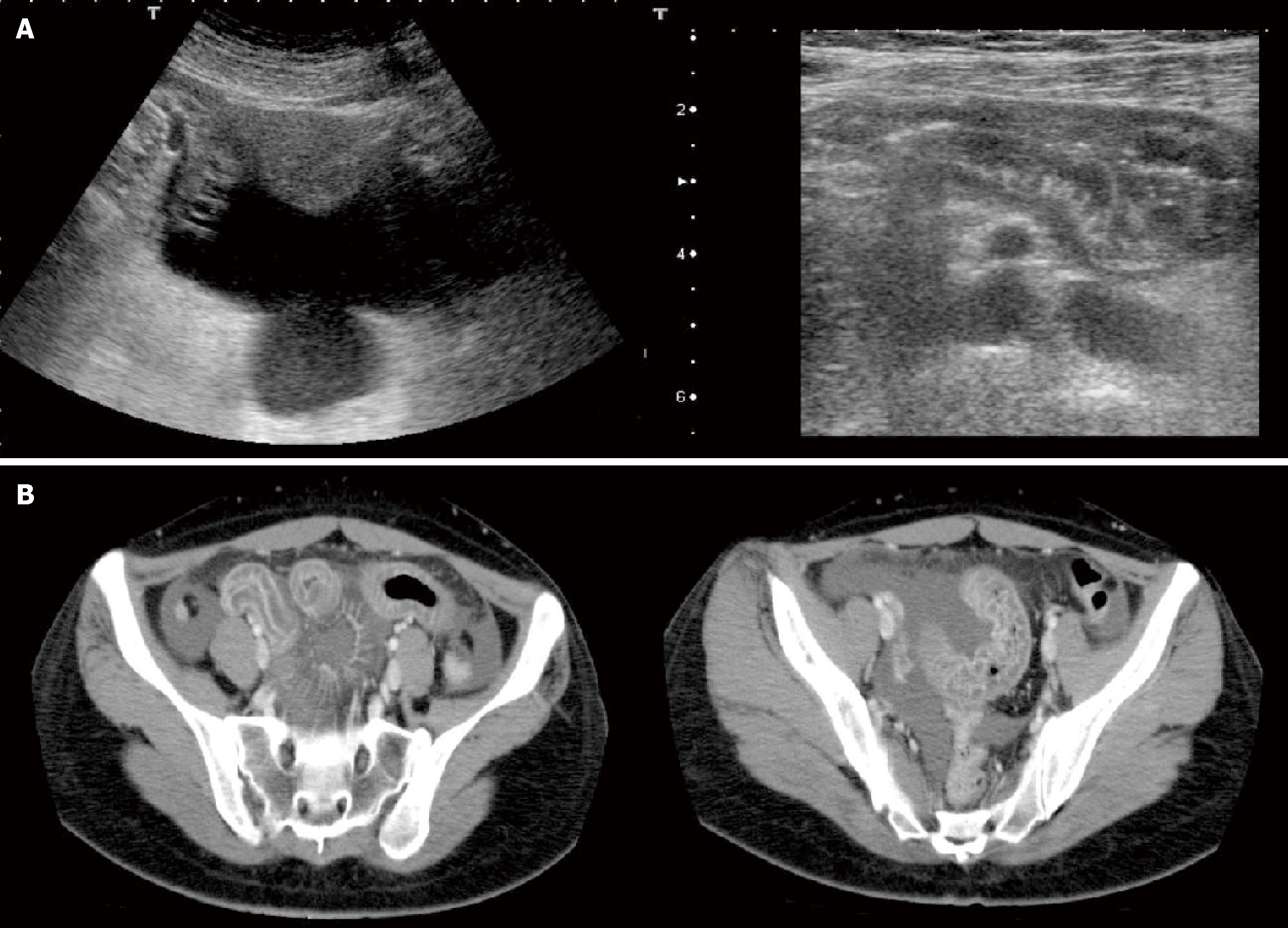 A: Abdominal ultrasound showing significant edema of the pelvic small intestine and ascending colon, and a moderate amount of ascites; B: Abdominal computed tomography scan showing significant edema of the pelvic small intestine and ascending colon, and a moderate amount of ascites.