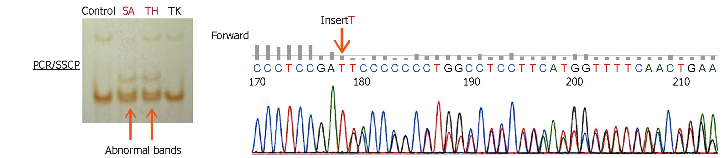 Direct sequencing of exon 5 revealed a T frameshift mutation between bases 8490 and 8491.