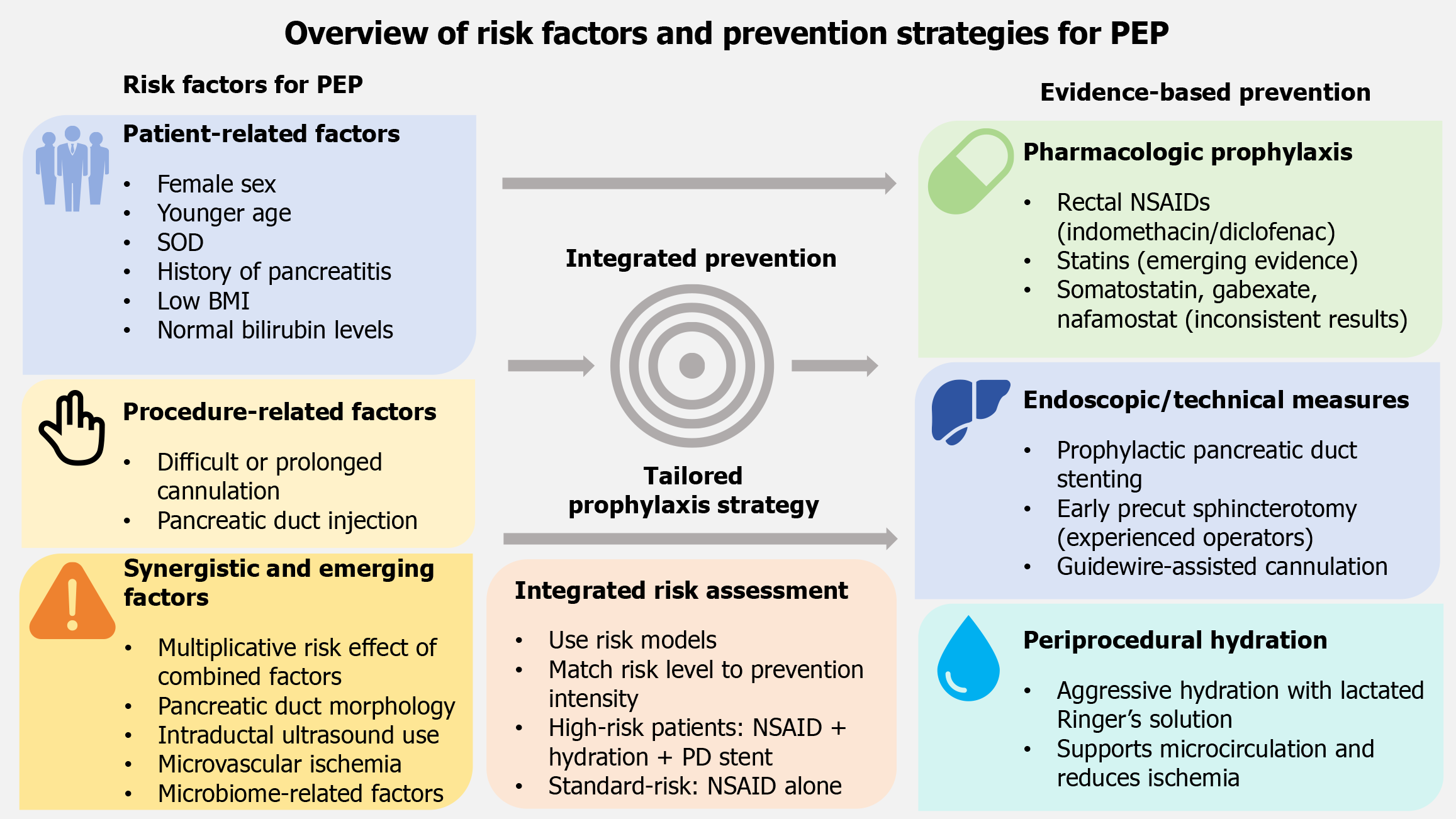 Figure 1 Overview of risk factors and evidence-based prevention strategies for post-endoscopic retrograde cholangiopancreatography pancreatitis.