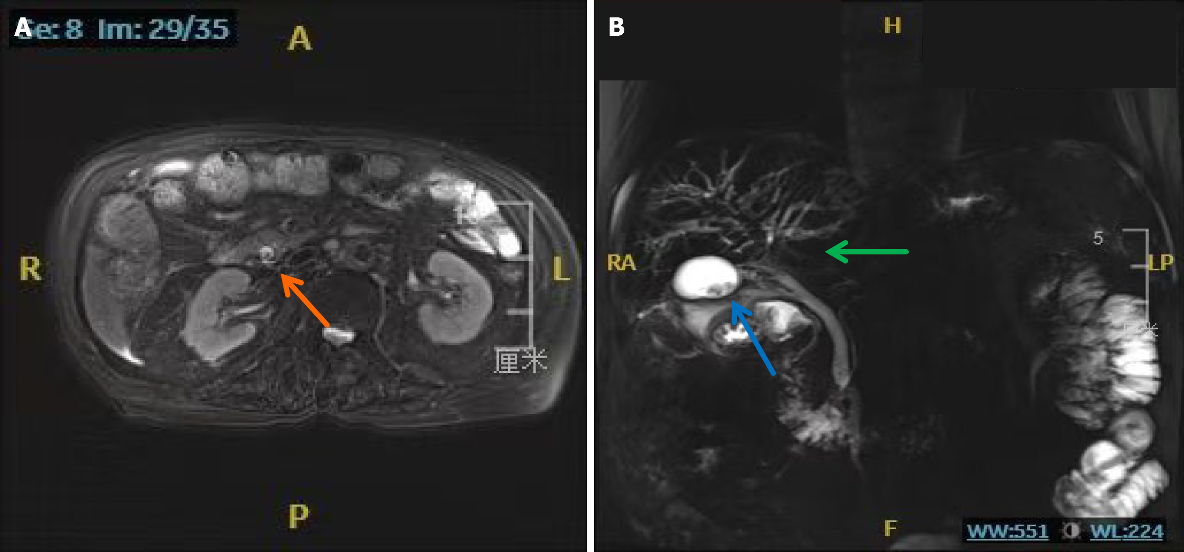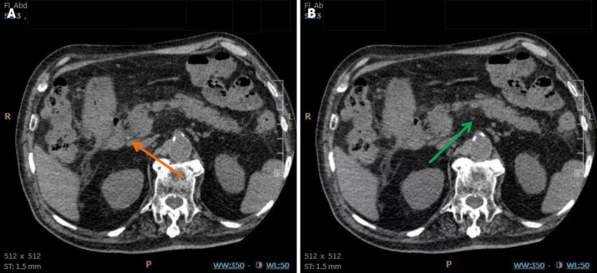 A: Common bile duct stone (orange arrow); B: Hazy peripancreatic fat stranding (green arrow).