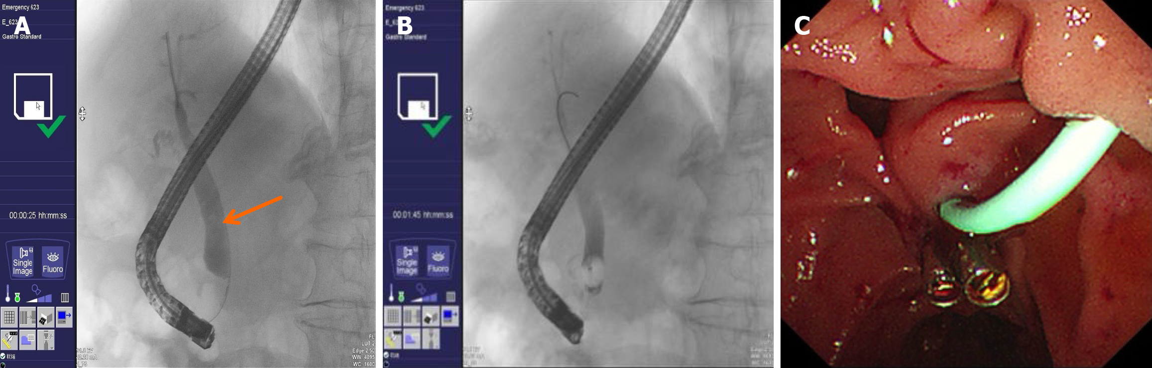 Figure 2 Endoscopic retrograde cholangiopancreatography with endoscopic sphincterotomy, stone extraction, and endoscopic retrograde biliary drainage performed on July 1, 2024.