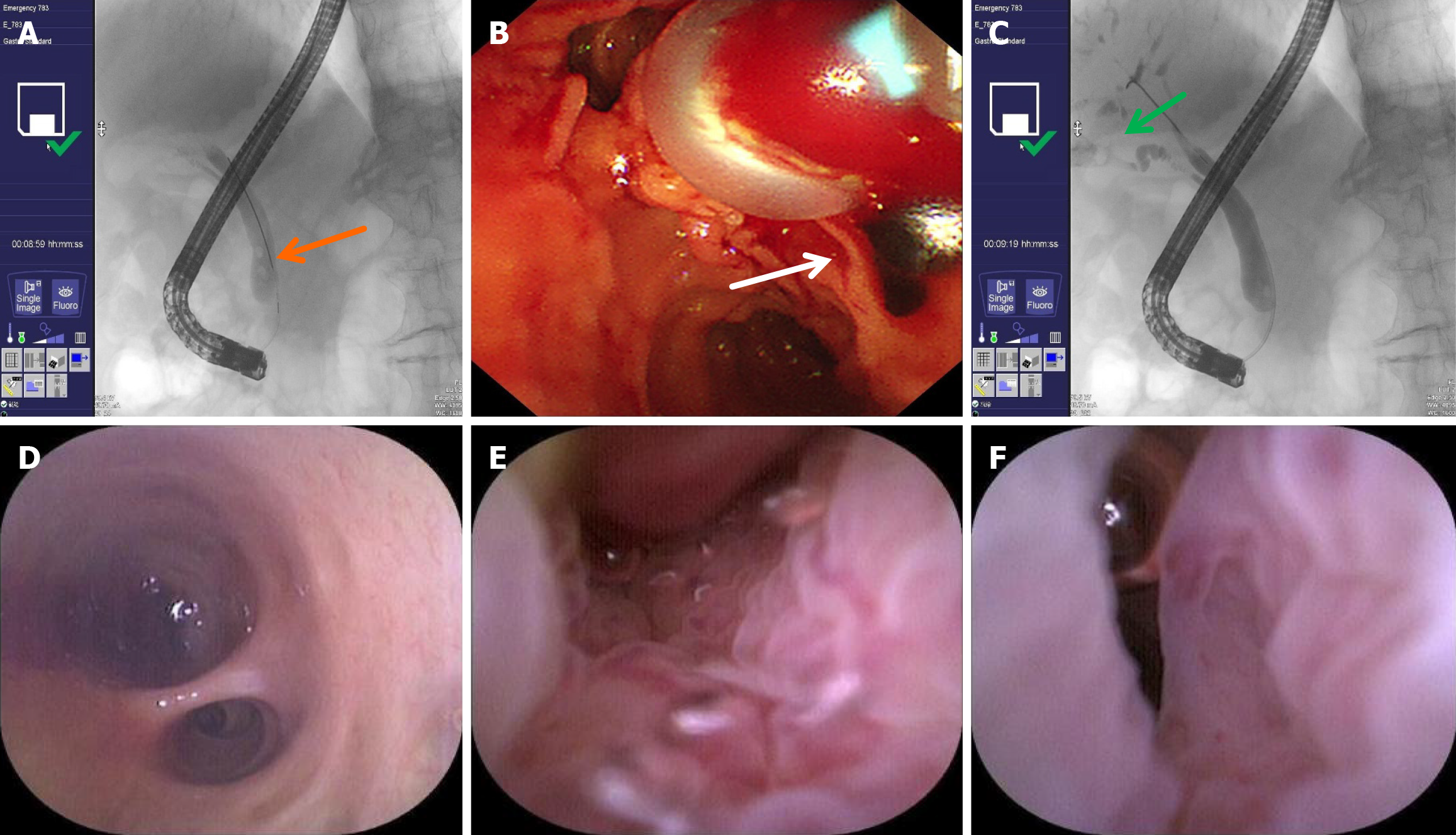 A: Common bile duct stones on cholangiography (orange arrow); B: Stones extracted with balloon (white arrow); C: Poor visualization of the bile duct at the hepatic portal region on cholangiography (green arrow); D: Common bile duct is normal; E: The mucosa of the common bile duct is rough with large, tortuous and irregular blood vessels; F: Narrow bile duct lumen.