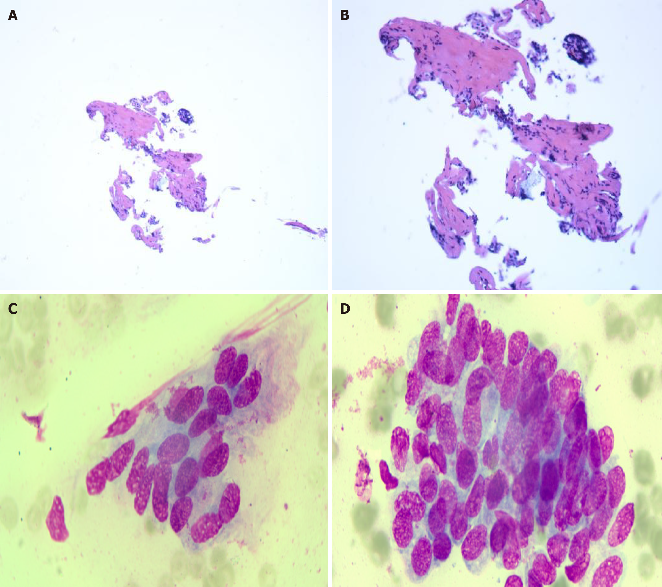 A and B: Sections of the common bile duct extending to the hepatic bifurcation show minimal fibrosis with chronic inflammatory cell infiltration (A: Hematoxylin and eosin staining, magnification × 40; B: Hematoxylin and eosin staining, magnification × 100); C and D: Bile duct brushings reveal epithelial cells with focal nuclear enlargement, an increased nuclear-to-cytoplasmic ratio, coarse hyperchromatic chromatin, and mild atypia. Correlation with clinical, radiologic, and histologic data is recommended (Wright-Giemsa staining, magnification × 1000).
