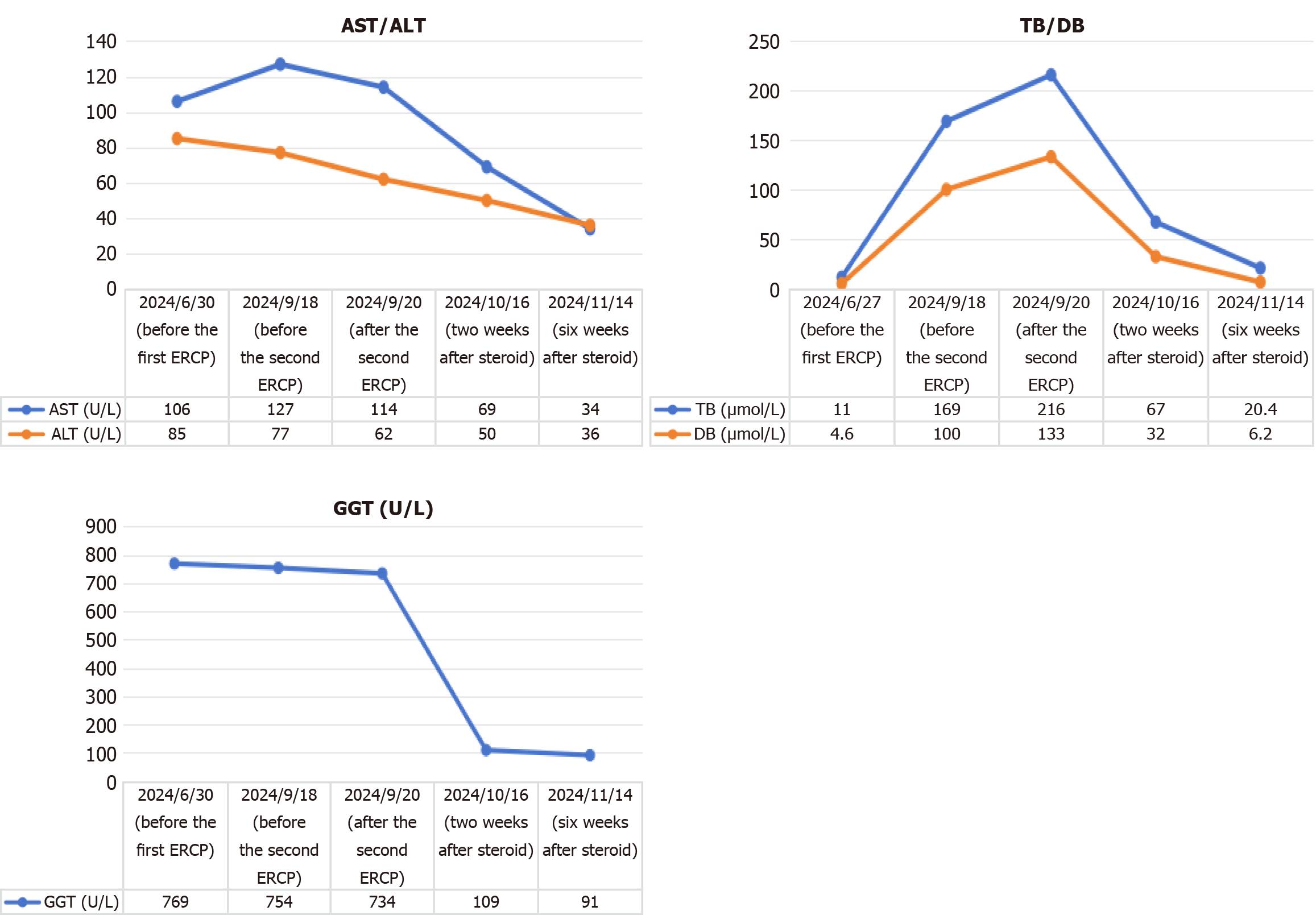 Serial measurements of aspartate aminotransferase, alanine aminotransferase, total bilirubin, direct bilirubin, and gamma-glutamyl transferase in the patient during the treatment process. ALT: Alanine aminotransferase; AST: Aspartate aminotransferase; ERCP: Endoscopic retrograde cholangiopancreatography; TB: Total bilirubin; DB: Direct bilirubin; GGT: Gamma-glutamyl transferase.