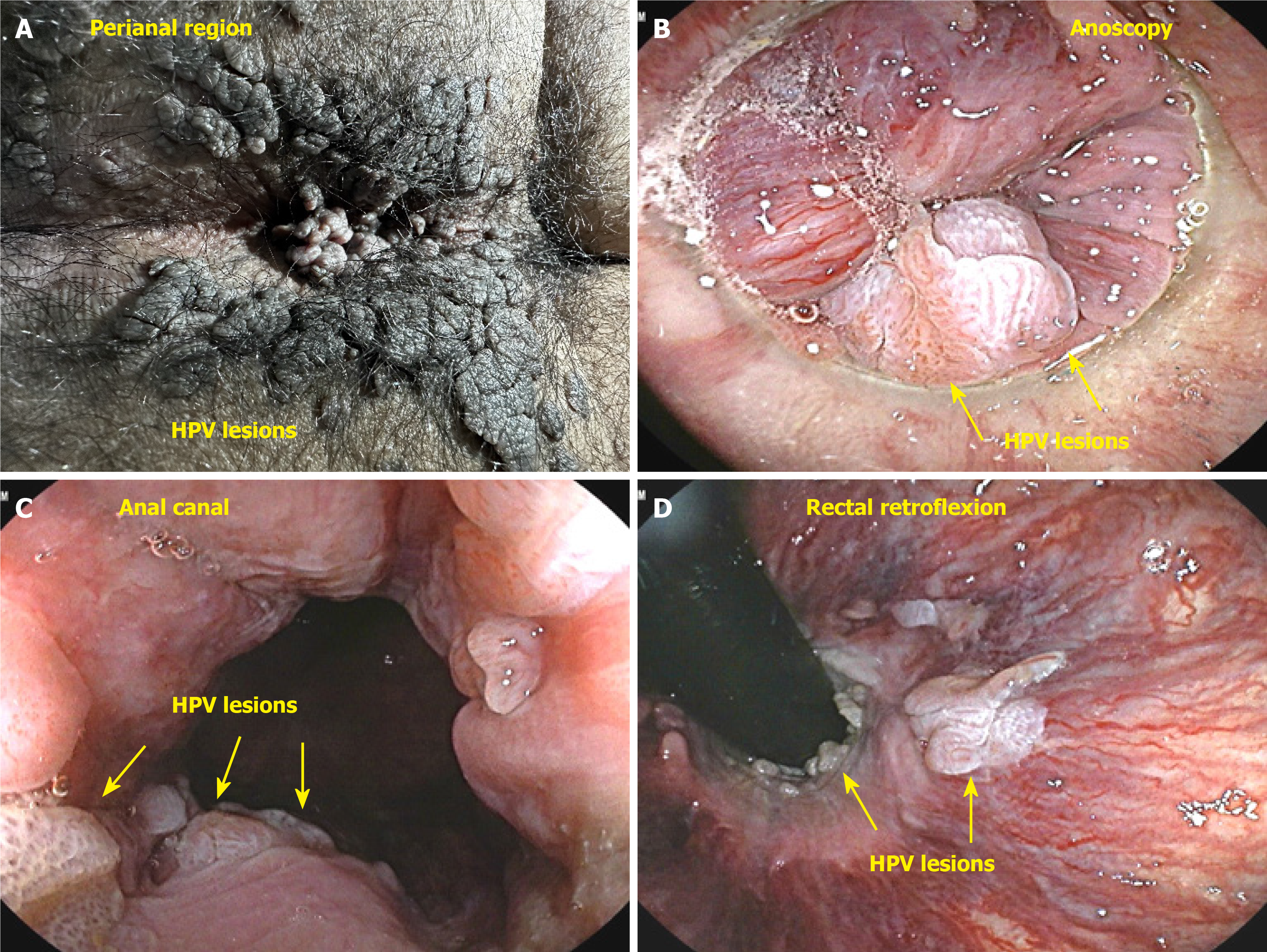 HPV is a sufficient cause of anal high-grade squamous intraepithelial lesion. Seropositivity for human immunodeficiency virus (HIV), herpes simplex virus type 2, treponema pallidum, hepatitis B virus, and hepatitis C virus, and a history of gonorrhea or chlamydia are powerful amplifying factors that increase the risk of high-grade squamous intraepithelial lesion above the risk of HPV alone[12]. The diagnosis of anal cancer involves several steps. A clinical history is taken, a digital anorectal examination is performed, and anoscopy or videoanoscopy may be used, which can be performed during a routine colonoscopy. Additional diagnostic tools include anal cytology with HPV screening and HIV testing and, in some cases, high-resolution anoscopy with biopsy and histological confirmation. It is essential to obtain a sexual history, particularly regarding sexually transmitted infections (STIs), such as HIV and HPV[12]. This includes asking about same-sex sexual activity in men and anal intercourse in women. However, it is worth noting that HPV and anal cancer can occur in individuals of any sex who have not engaged in anal intercourse. Men are primarily asymptomatic carriers and transmitters of HPV. Therefore, vaccinating boys between the ages of 11 and 15 is crucial. This treatment effectively blocks viral transmission and prevents the development of HPV-related cancer[13].