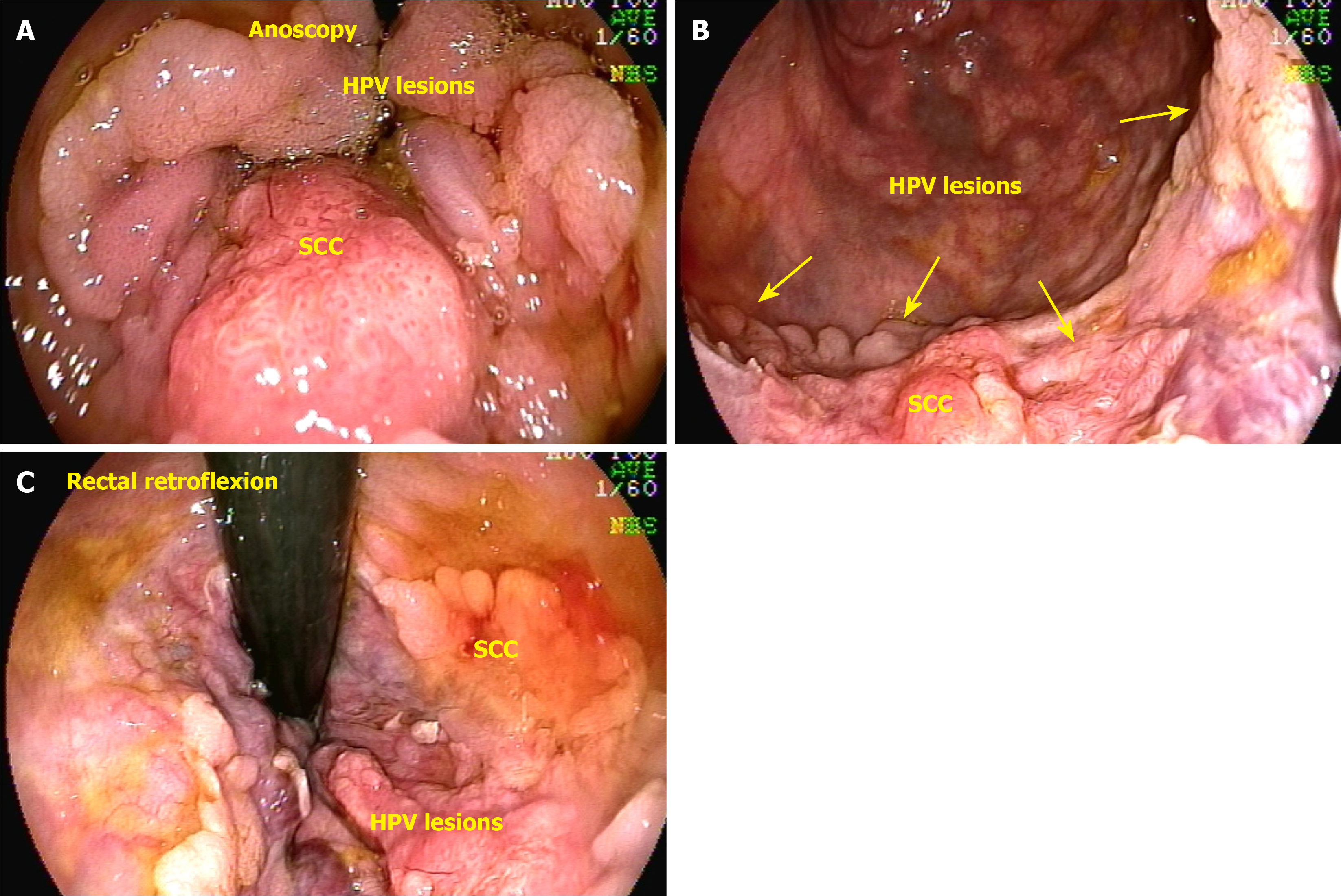 Smoking and immunosuppressant use are significant risk factors for anal lesions. A proctological examination for suspected anal lesions involves a thorough inspection of the anal margin, as well as careful circumferential palpation to assess for the presence of nodules or masses. In addition, inguinal lymph node palpation is performed to detect suspicious lymphadenopathy. Further diagnostic procedures may include anoscopy or videoanoscopy, collection of anal cytology samples for HPV detection and, if necessary, high-resolution anoscopy[2,3,14]. Conventional anoscopy can be performed during the initial consultation without any preparation. The necessary equipment includes a disposable plastic anoscope and a light source specifically designed for the anoscope. The procedure is typically performed without sedation and is generally well tolerated by patients. Conventional anoscopy has several limitations, particularly in terms of obtaining a clear view of lesions within the anal canal. In some cases, examination may be difficult or even impossible because of pain or the presence of feces. Videoanoscopy, on the other hand, is performed during colonoscopy, with the patient under sedation and the colon properly prepared. This allows for the capture of highly magnified, high-definition images using the colonoscope’s advanced chromoscopy and magnification capabilities. The images are then recorded and stored, with a detailed description of the proctological examination included in the colonoscopy report[1,6].