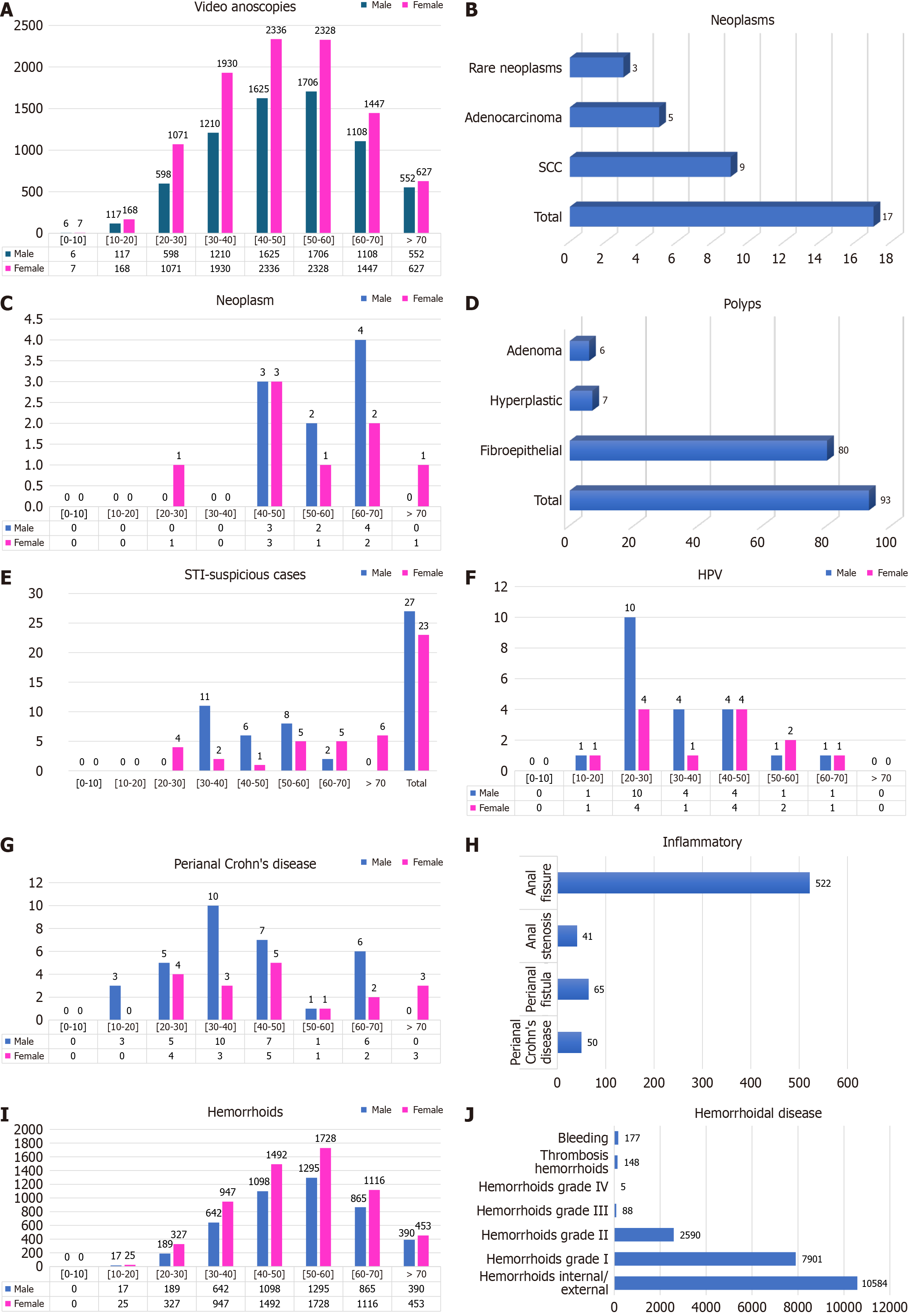 In total, 22676 examinations (colonoscopies with anal examination and video anoscopies) were evaluated in 16836 patients (Table 2), comprising 6922 males (41.11%) and 9914 females (58.89%) (Figure 7A). The mean age was 49 years. On the basis of these findings, 4629 video anoscopies were normal (27.49%), and 12207 (72.51%) had some alterations. We found 17 cases of neoplasms (0.10%), of which 9 cases were SCC (0.05%), 5 cases were adenocarcinoma (0.03%), and 3 cases were rare neoplasias (0.02%) (Figure 7B). Among the 9 patients with SCC (52%), 5 were women, and 4 were men. Among the 5 patients with adenocarcinoma (29%), 2 were women, and 3 were men. There were 3 cases (19%) of rare neoplasia: Gastrointestinal stromal tumor, cavernous hemangioma, and angioleiomyoma (Figure 7C). Polyps were found in the anal canals of 93 patients, of which 80 were fibroepithelial (86%), 7 were hyperplastic polyps (7%), 6 were adenomas (6%), 4 were serrated adenomas, 1 was a tubular adenoma, and 1 was a tubulovillous adenoma with high-grade dysplasia (Figure 7D).