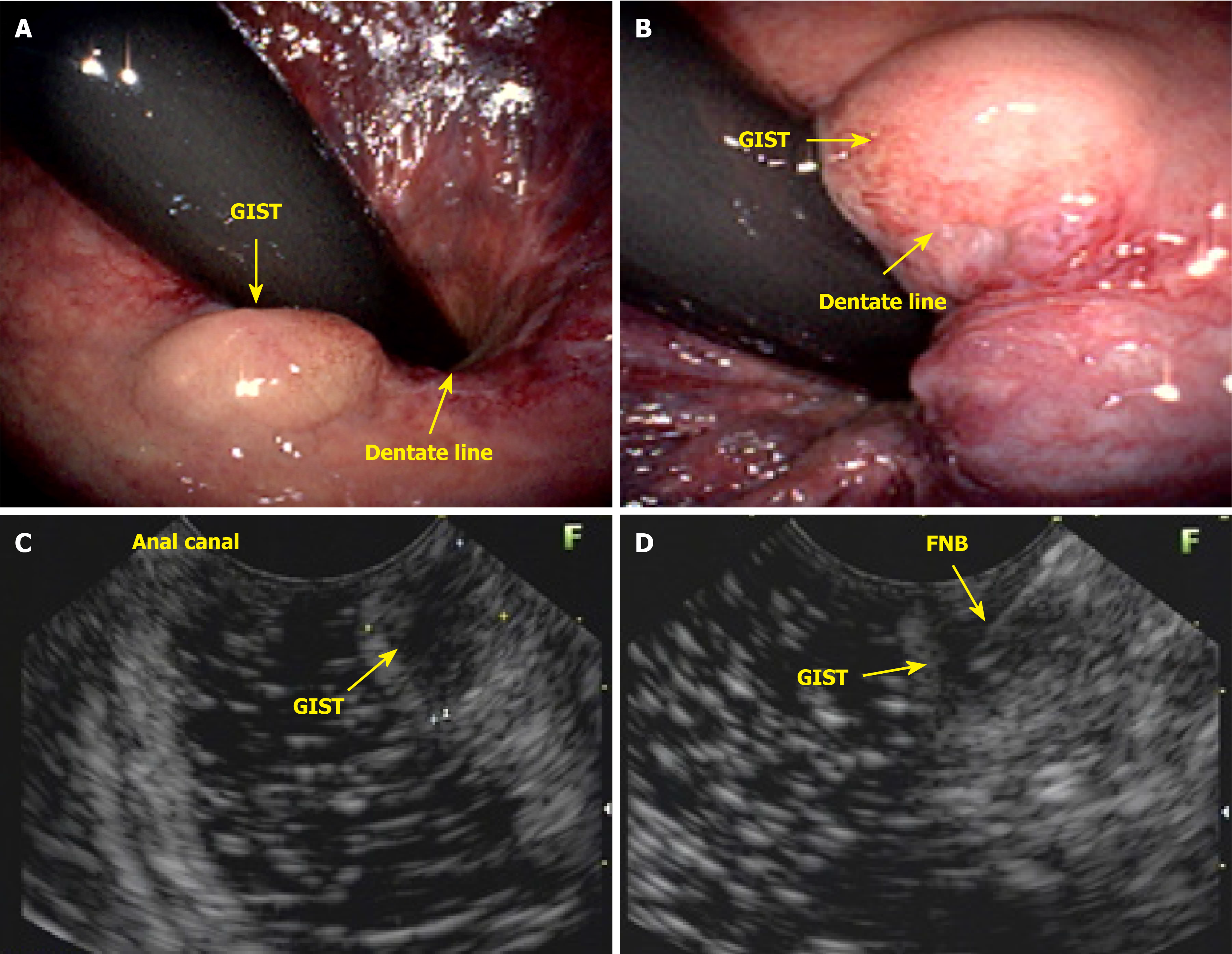 As the number of requests for colonoscopy from clinicians, gynecologists, and physicians outside the field of coloproctology continues to rise, the responsibility of diagnosing, treating, and guiding patients with anal lesions often falls to the endoscopist. In countries with limited healthcare systems, where patients face challenges accessing specialists, an endoscopist with knowledge of anal pathologies can diagnose these lesions and, in many cases, provide the necessary treatment. Furthermore, the endoscopist should remove premalignant anal canal lesions (Figure 8). Lesions in the anal canal should be biopsied or removed during colonoscopy. This patient presented with a subepithelial nodule in the anal canal, which was evaluated and biopsied via endoscopic ultrasound. Histological analysis revealed a gastrointestinal stromal tumor (Figure 9).