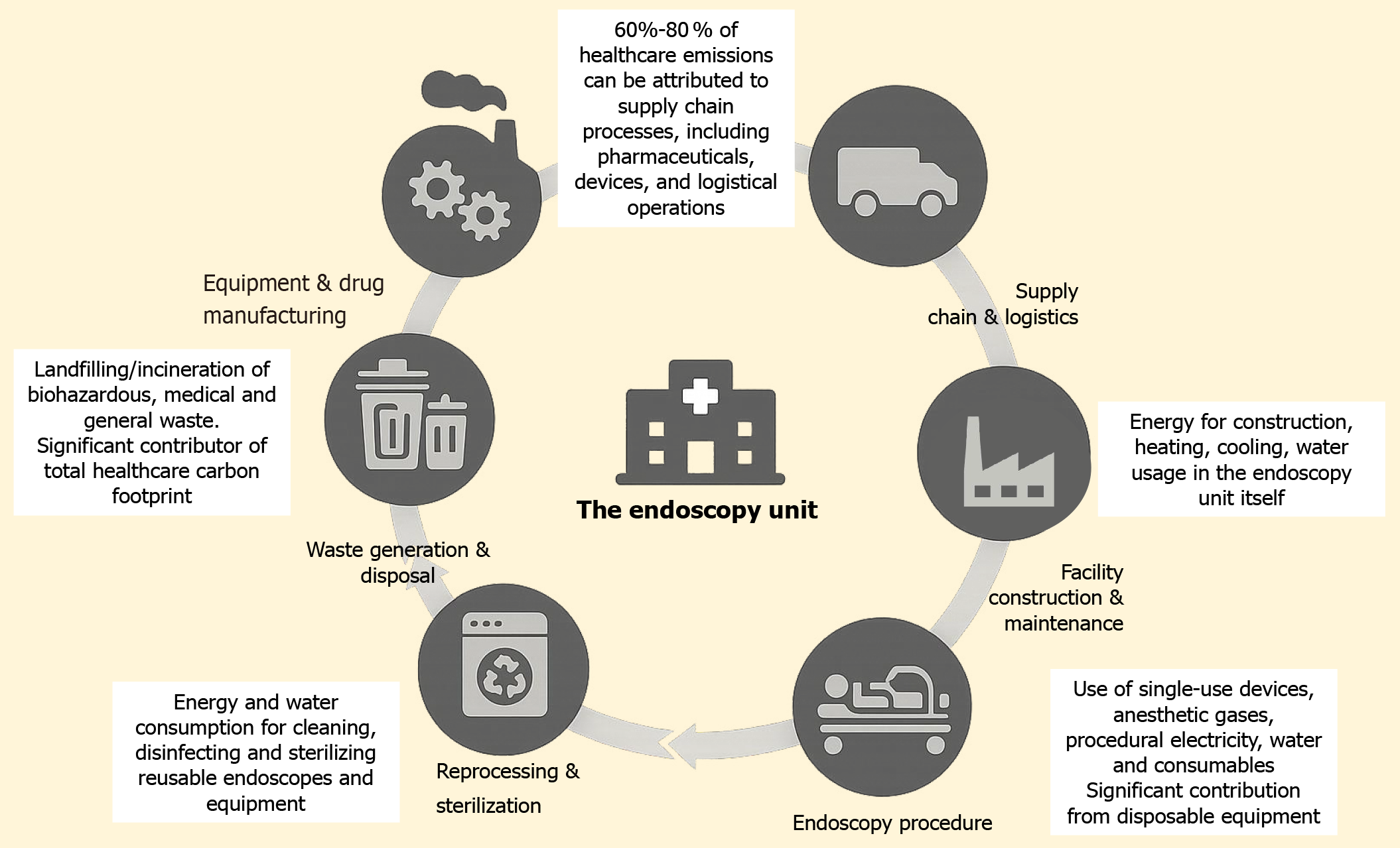 Gastrointestinal endoscopies have significantly contributed to the medical carbon footprint mainly due to the myriad of resources that go into performing endoscopy and the waste it generates[3,4] Carbon footprint is quantified in carbon dioxide equivalent emissions. This activity results in an estimated annual emission of 85768 metric tons of carbon dioxide equivalent in the United States. The caseload of endoscopies in the United States is enormous, estimated to be approximately 22162641 cases performed in 2019[3]. Gastrointestinal endoscopy-related carbon footprint is not only directly related to the procedure itself, but also incorporates the patient and industry-related factors. Patients must prepare (bowel preparation for colonoscopy) and arrange travel for the procedure. Equipment needs to be manufactured and processed, including waste disposal, which are industry-related factors. An estimated 30000 metric tons of waste is generated annually from all the endoscopic procedures performed in the United States. This waste is enough to cover 117 soccer fields to a depth of one meter[4]. As per the 2023 United States Environmental Protection Agency report, organizations’ supply chains account for more than 90% of greenhouse gas emissions[5]. The environmental footprint of the endoscopy unit extends well beyond the procedure room, including unseen elements such as the supply chain, energy consumption, and waste management. This review explores strategies to recognize, promote, and incentivize energy-smart initiatives to reduce the carbon footprint of endoscopy waste (Figure 1).