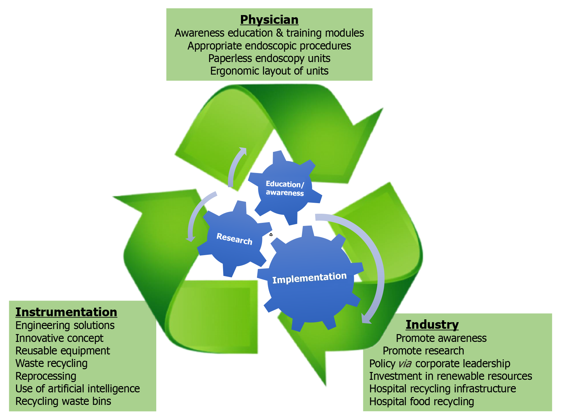 The endoscopy unit is the third largest department in medical waste across various healthcare facilities. Park and Cha[6] associated it with high case volumes, commute to the units, many nonrenewable wastes, and single-use devices. Calculations involving the precise quantification of carbon footprint would entail a complicated and tedious evaluation and knowledge of the entire lifecycle of any product, right from its manufacture, distribution, utilization, and subsequent disposal or energy expenditure for recycling. Although it appears to be a Herculean task, especially considering the multiple variables at play, an educated and extrapolated carbon footprint estimate would still support the concept of green endoscopy by reducing and recycling products as much as possible[7]. A recent study in Asia assessed the awareness and acceptance of green endoscopy among healthcare workers[8]. Of 259 valid responses, 79.5% of participants agreed to incorporate green endoscopy into their practice. However, only 12.7% of respondents reported existing green policies[8]. Potential barriers to implementing green endoscopy include healthcare cost increment, infection risk, inadequate awareness, and lack of policy and industrial support. Herein, we discuss the roles of physicians, gastrointestinal societies, hospital systems, endoscopy innovation, and current guidelines to improve and implement its awareness[9].