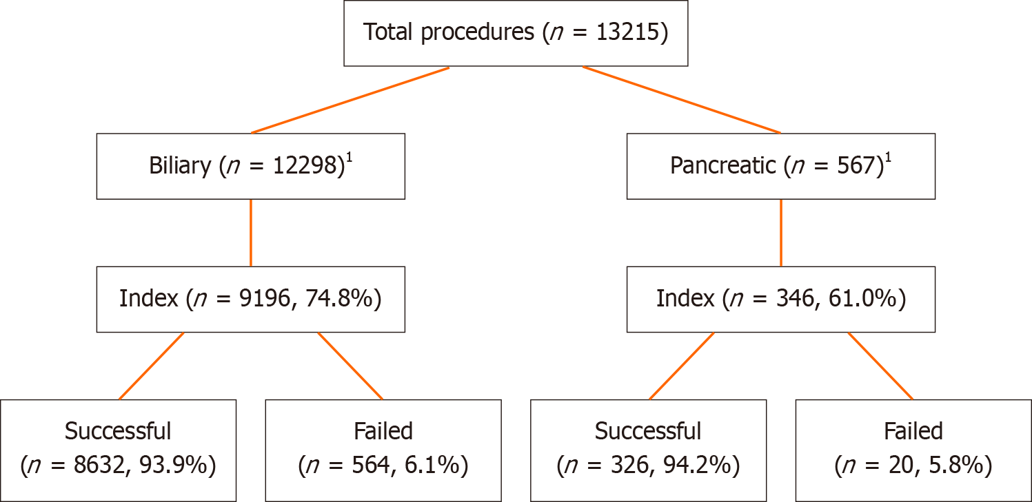 A total of 12298 procedures were biliary ERCP, and 567 procedures were pancreatic ERCP. The ampulla was inaccessible due to gastric or duodenal outlet obstruction in 350 patients. Successful cannulation during index ERCP for biliary cases was 93.9% and 94.2% for index ERCP for pancreatic cases (Figure 1 and Table 3).