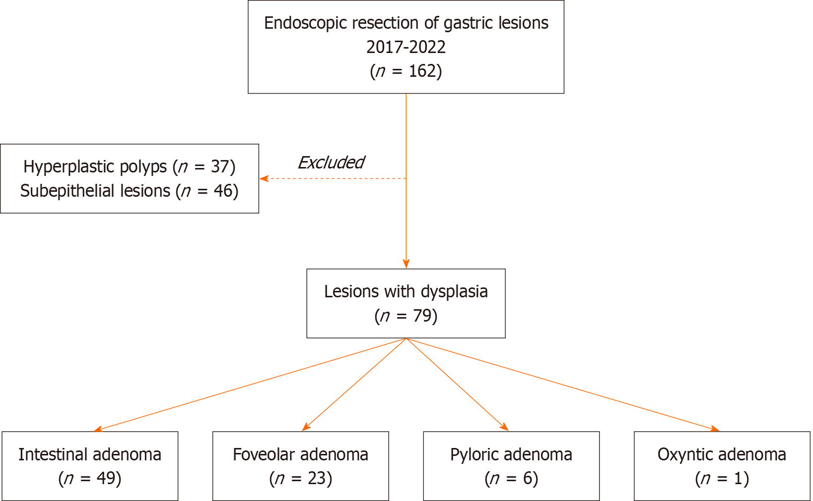 Of the 162 patients who underwent endoscopic ER for gastric lesions between 2017 and 2022, 79 were included in this study following diagnosis of gastric adenoma. Patients with hyperplastic polyps (n = 37) or subepithelial lesions (n = 46) were excluded. The 79 patients were classified into four groups based on histological subtypes of gastric adenoma: Intestinal (n = 49), foveolar (n = 23), pyloric (n = 6), and oxyntic (n = 1) (Figure 1).