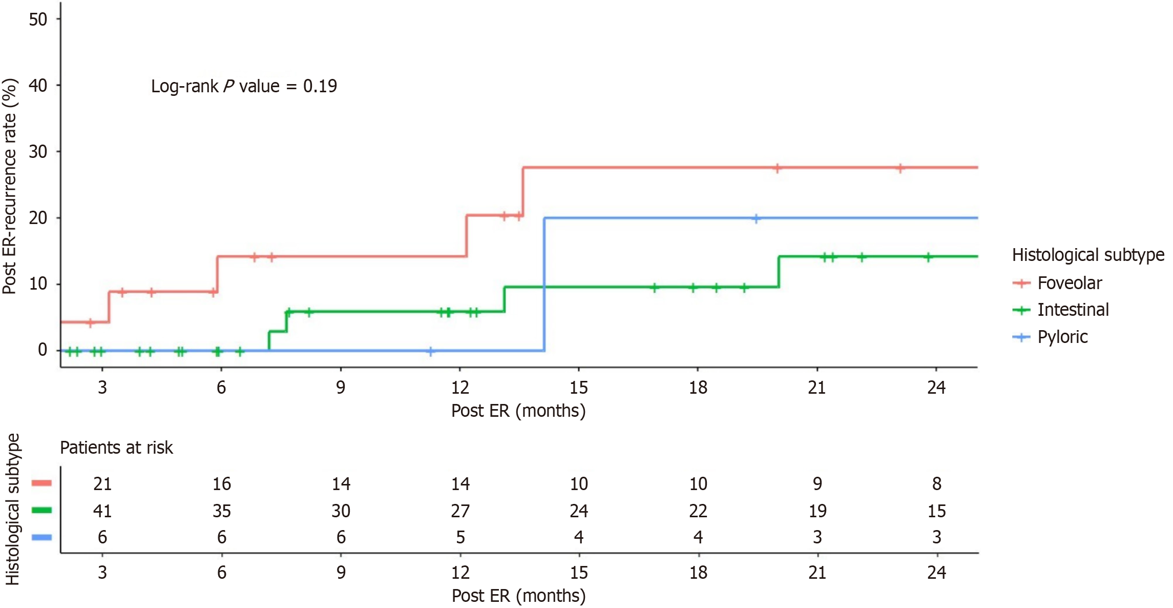 A higher post-ER recurrence rate was observed in the foveolar group (20% at 1 year, 28% at 2 years) than in the intestinal group (5.9% at 1 year, 14% at 2 years) and the pyloric group (0% at 1 year, 20% at 2 years); however, the difference was not statistically significant (log rank P = 0.19) (Figure 3).