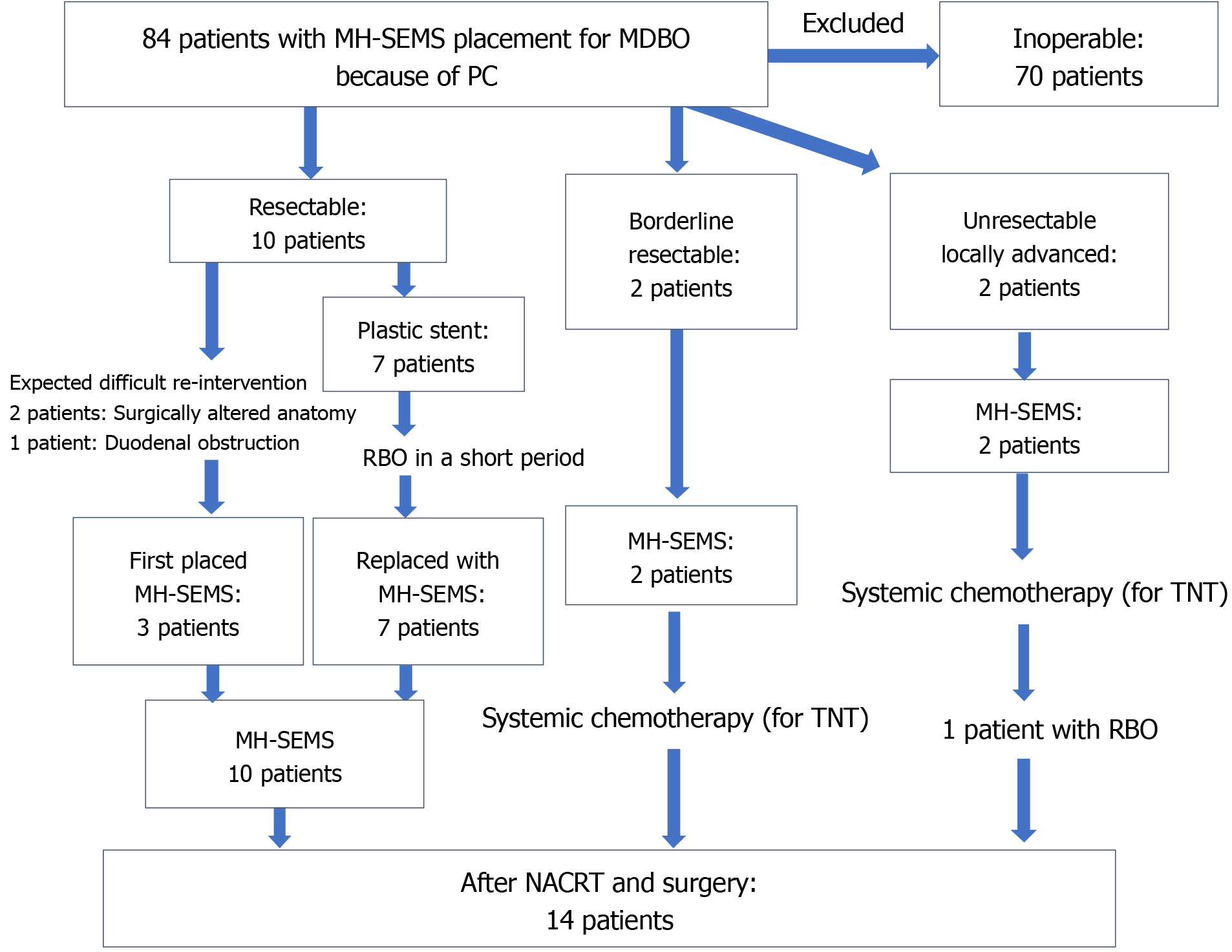 We enrolled 84 patients who underwent MH-SEMS for MDBO caused by PC at our hospital between April 2023 and March 2025. Of these patients, 70 did not undergo surgery because of advanced PC stage, severe comorbidities, or refusal of surgery and were excluded from this study. Figure 1 shows the patient flowchart for this study. Ten patients were diagnosed with R-PC; three underwent MH-SEMS placement as initial biliary drainage, whereas seven required reintervention for early PS obstruction before starting NACRT. All patients with R-PC underwent curative surgery after NACRT. Two patients with BR-PC underwent MH-SEMS placement as initial biliary drainage and were first treated with systemic chemotherapy. Subsequently, these patients underwent NACRT (TNT) followed by curative surgery. Furthermore, two patients were initially diagnosed with unresectable locally advanced PC (UR-LAPC). Particularly, the tumor involved the celiac artery at an angle exceeding 180° in one patient and involved the superior mesenteric artery in the other patient. They underwent MH-SEMS placement as initial biliary drainage and were initially treated with systemic chemotherapy, followed by NACRT (TNT) and subsequent curative surgery.