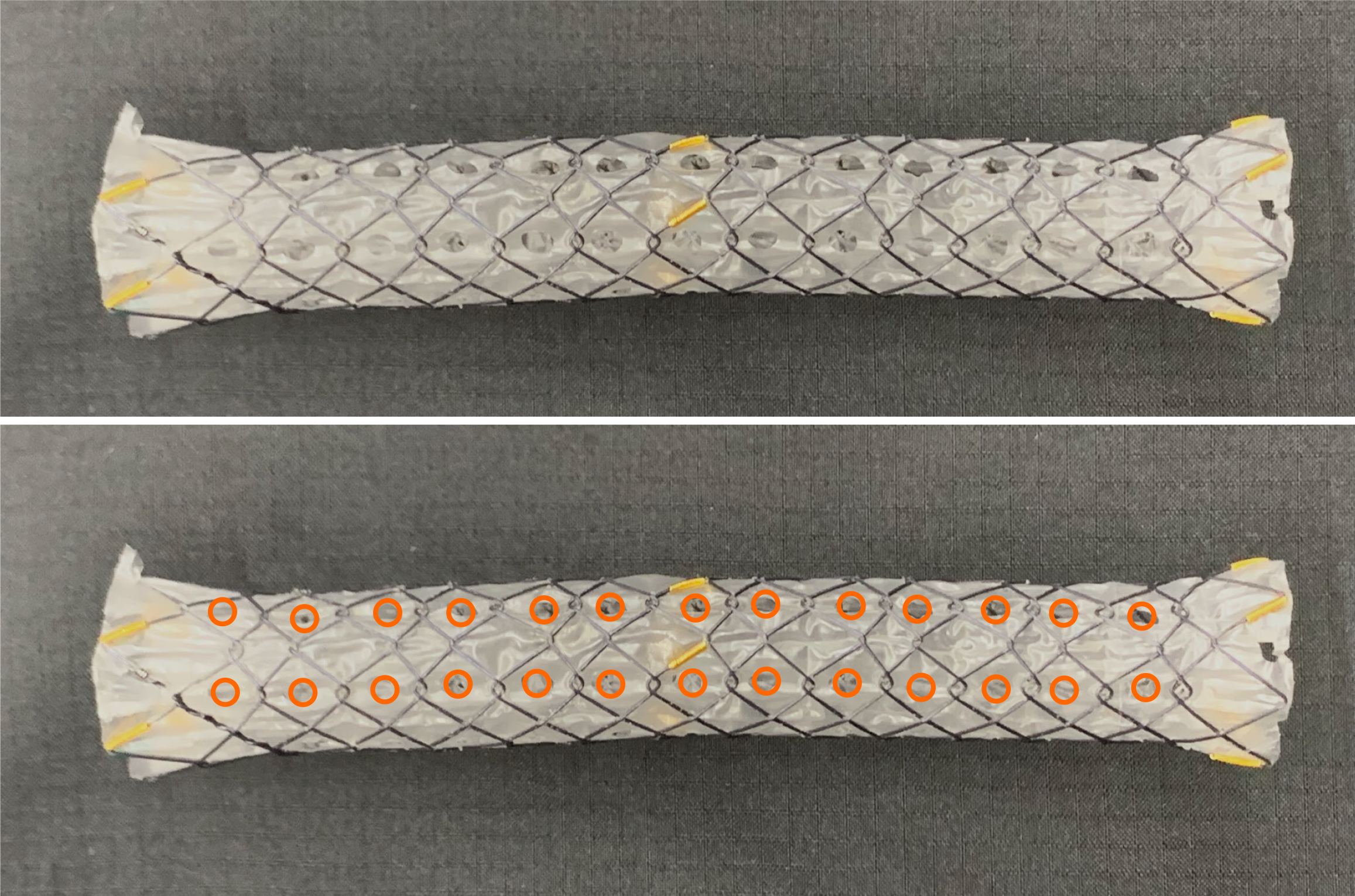 Six rows of side holes were drilled on the membrane, aligning with the longitudinal direction of the stent (orange circles). Each side hole had a diameter of 1.8 mm.