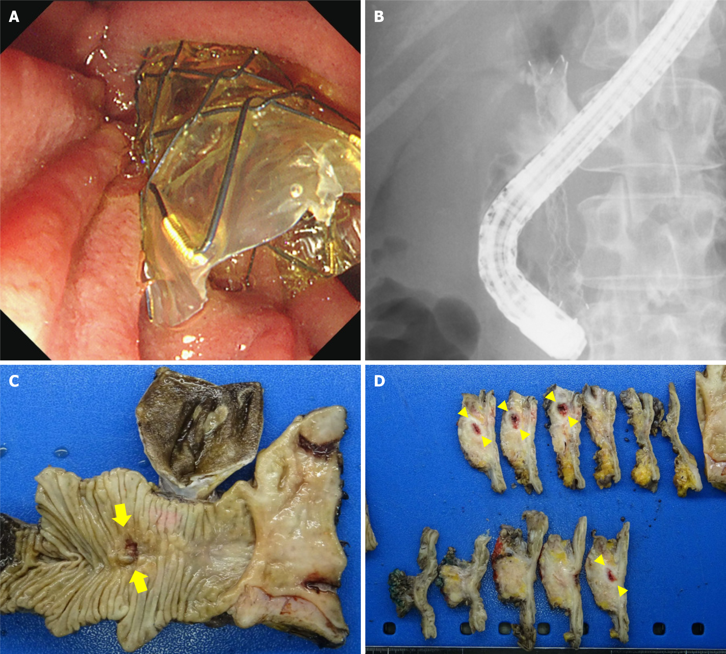 A: The endoscopic image. A multi-hole self-expandable metallic stent (MH-SEMS) was inserted in a patient with malignant distal biliary obstruction caused by borderline resectable pancreatic cancer with portal vein invasion; B: The fluoroscopic image of MH-SEMS; C: After surgery (pancreatoduodenectomy with portal vein resection), the stent was easily removed from the surgical specimen. The yellow arrow points to the Papilla of Vater after stent removal; D: The resected specimen was diagnosed appropriately without being affected by stent removal. The yellow arrowheads denote the common bile duct after stent removal.
