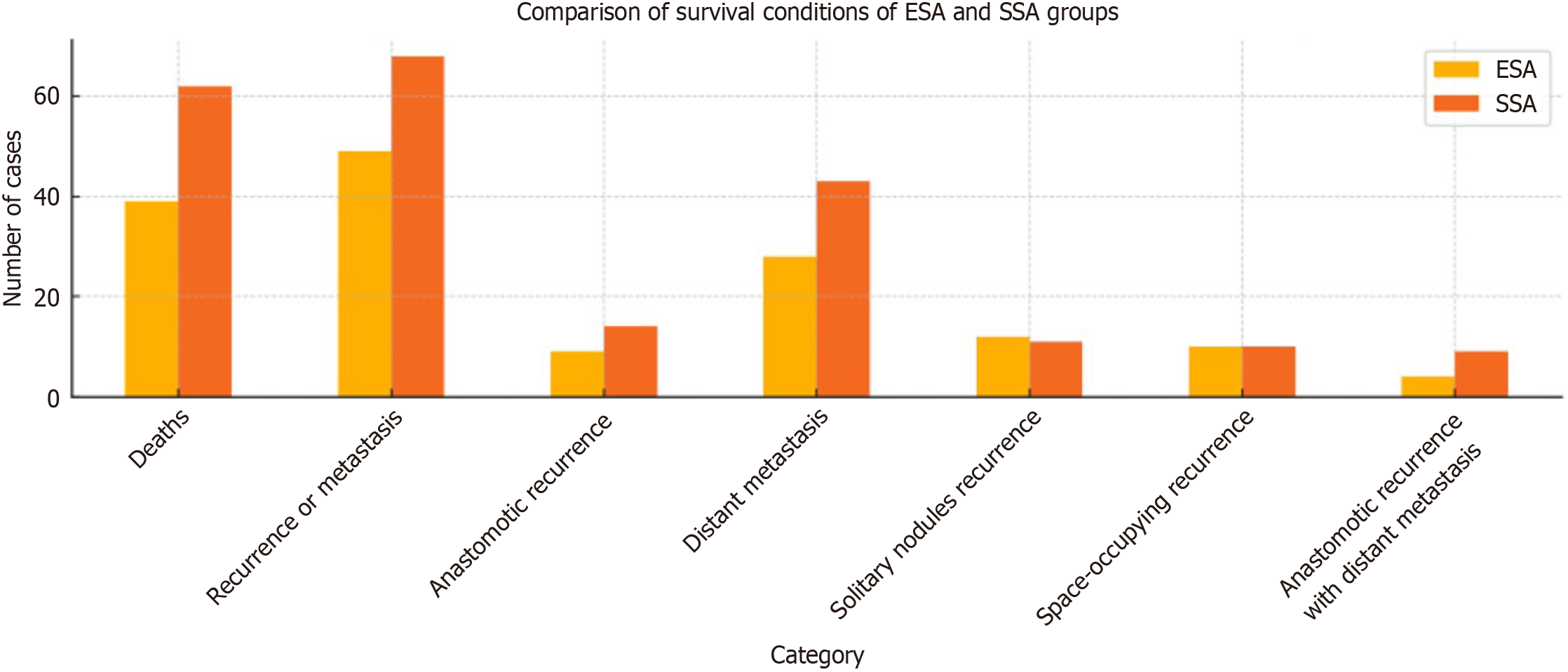 A total of 334 patients were included, with 105 patients from the First Affiliated Hospital of Xiamen University and 229 patients from the First Affiliated Hospital of Fujian Medical University, between January 1, 2012, and May 31, 2020. The patients were divided into two groups: 146 cases in the ESA group and 188 cases in the SSA group. Clinical data from both groups were compared, and the survival prognosis was followed up.