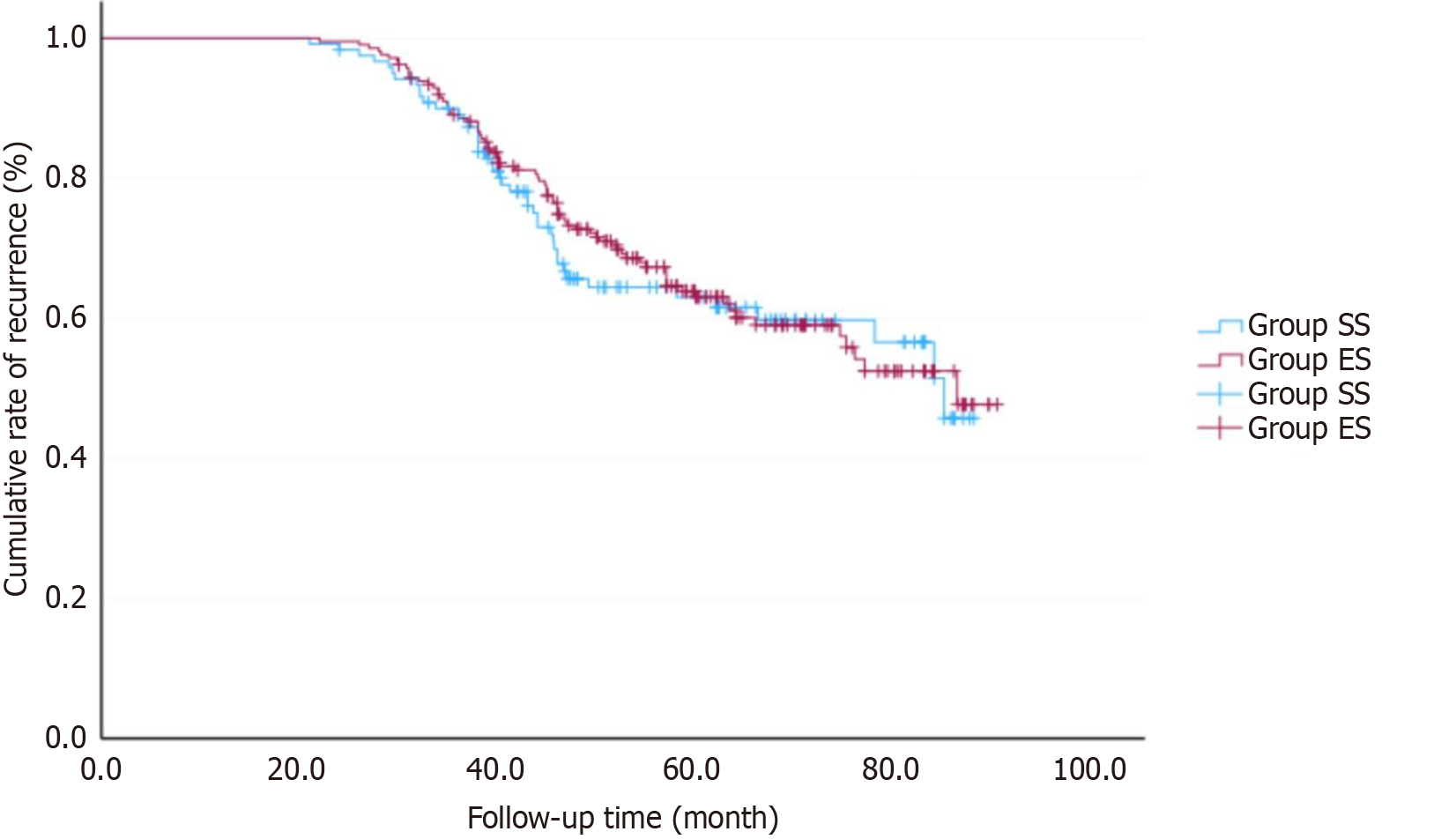 The follow-up period lasted for an average of 54.6 months, ranging from 21 to 90 months. Patients in Stage IIb-III underwent CAPEOX chemotherapy (Oxaliplatin 130 mg/m2 on day 1; Capecitabine 1000 mg/m2 twice daily from day 1 to day 14) within 6 months after surgery. By May 2020, in the ESA group, 39 patients (26.7%) had died, and 49 patients (33.6%) experienced recurrence or metastasis, including 9 cases of anastomotic recurrence, 28 cases of distant metastasis, 12 cases of solitary nodules recurrence in the surgical area, 10 cases of space-occupying recurrence in the surgical area with distant metastasis, and 4 cases of anastomotic recurrence with distant metastasis. In the SSA group, there were 62 deaths (33.0%), and 68 cases (36.2%) of recurrence or metastasis, which included 14 cases of anastomotic recurrence, 43 cases of distant metastasis, 11 cases of solitary nodules recurrence in the surgical area, 10 cases of space-occupying recurrence in the surgical area with distant metastasis, and 9 cases of anastomotic recurrence with distant metastasis (Figure 2). The 5-year overall survival rate for all patients was 69.8% (233/334). In the ESA group, the 5-year disease-free survival (DFS) rate was 66.4% (97/146), while the 5-year DFS rate in the SSA group was 63.8% (120/188). There was no significant difference between the two groups (χ2 = 0.156, P = 0.693) (Figure 3).
