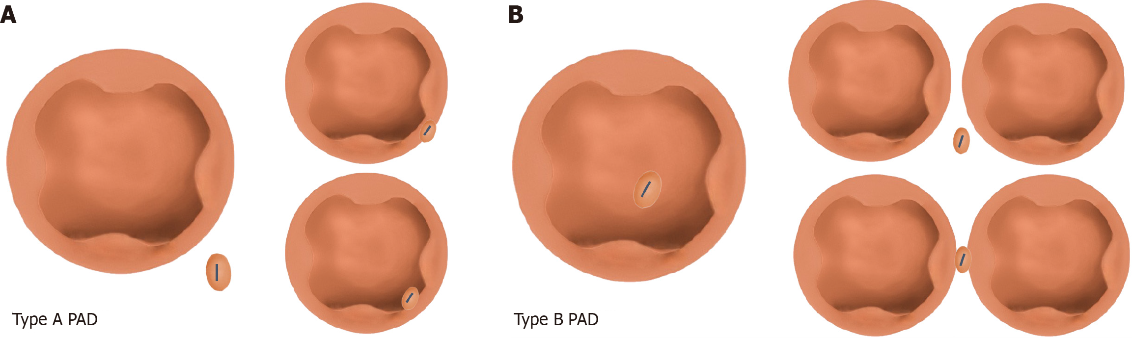 Baseline data included the following: Age, gender, medical history of hypertension, diabetes, coronary heart disease, and viral hepatitis (including hepatitis B and hepatitis C), and history of gallstone surgery. Intraoperative indicators included the use of cannulation method (≥ 1 pancreatic duct guidewire placement) and presence/absence of PAD. Patients with PAD were allocated to the PAD group, while those without PAD were assigned to the non-PAD group. According to the typing criteria proposed by Panteris et al[6], the PAD group was further stratified into two subgroups: The type A PAD subgroup (papilla located at the edge of the diverticulum or within a radius of 2 cm from the diverticular edge) and the type B PAD subgroup (papilla located inside the diverticulum or lying between two adjacent diverticula; Figure 1). Postoperative indicators were the presence of PEP and/or hyperamylasemia.