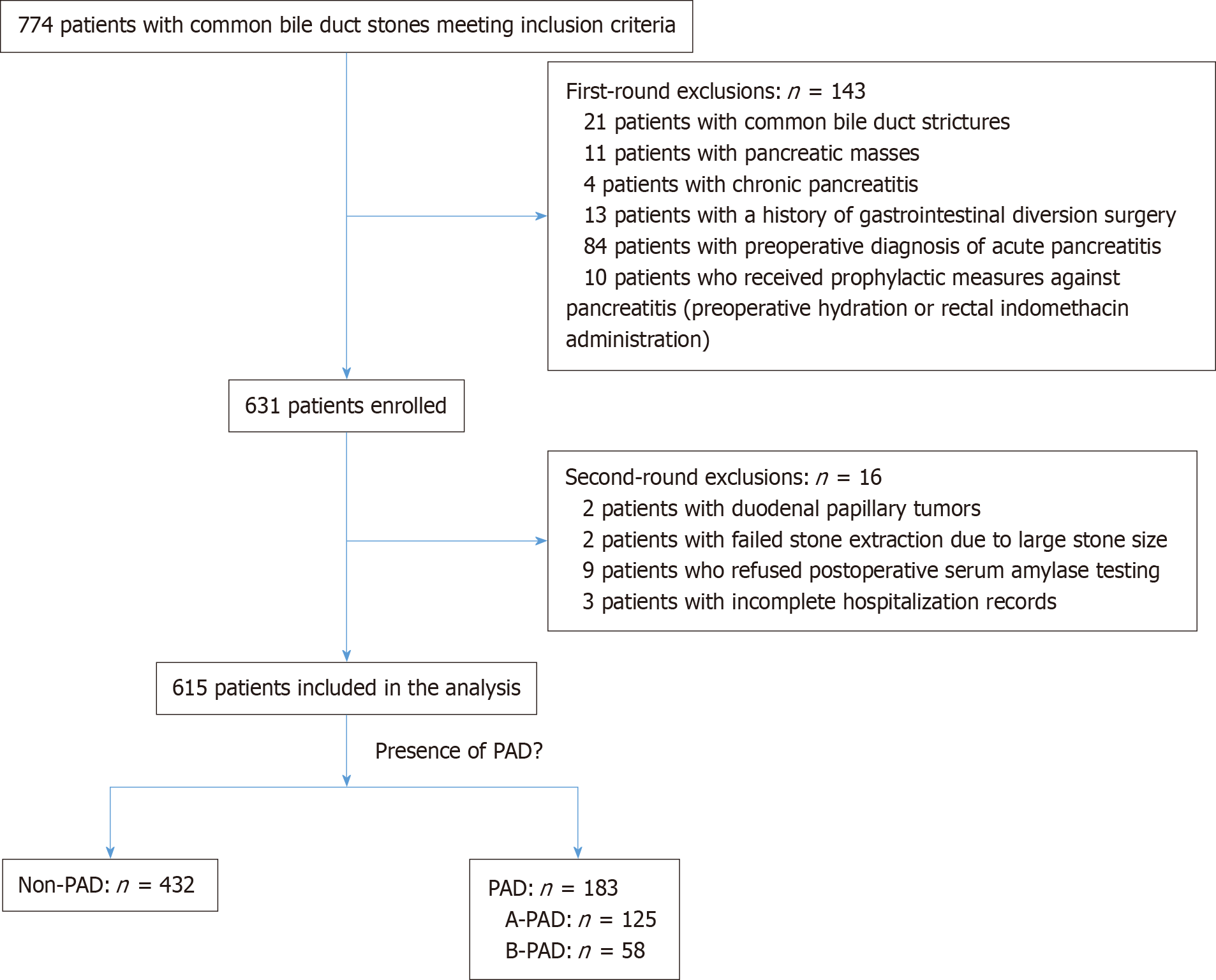 Following application of the predefined inclusion and exclusion criteria, 615 patients were included in the final analysis. The study population comprised 183 patients with PAD (type A: n = 125; type B: n = 58) and 432 patients without PAD (Figure 2). Comparative analysis of demographic and clinical characteristics revealed similar distributions between groups for sex, hypertension prevalence, diabetes mellitus, coronary artery disease, hepatitis status, and cholecystectomy history (all P > 0.05). However, patients in the PAD group showed higher mean age compared to the non-PAD group (69.0 ± 12.8 years vs 61.6 ± 15.9 years, P < 0.001; Table 1).