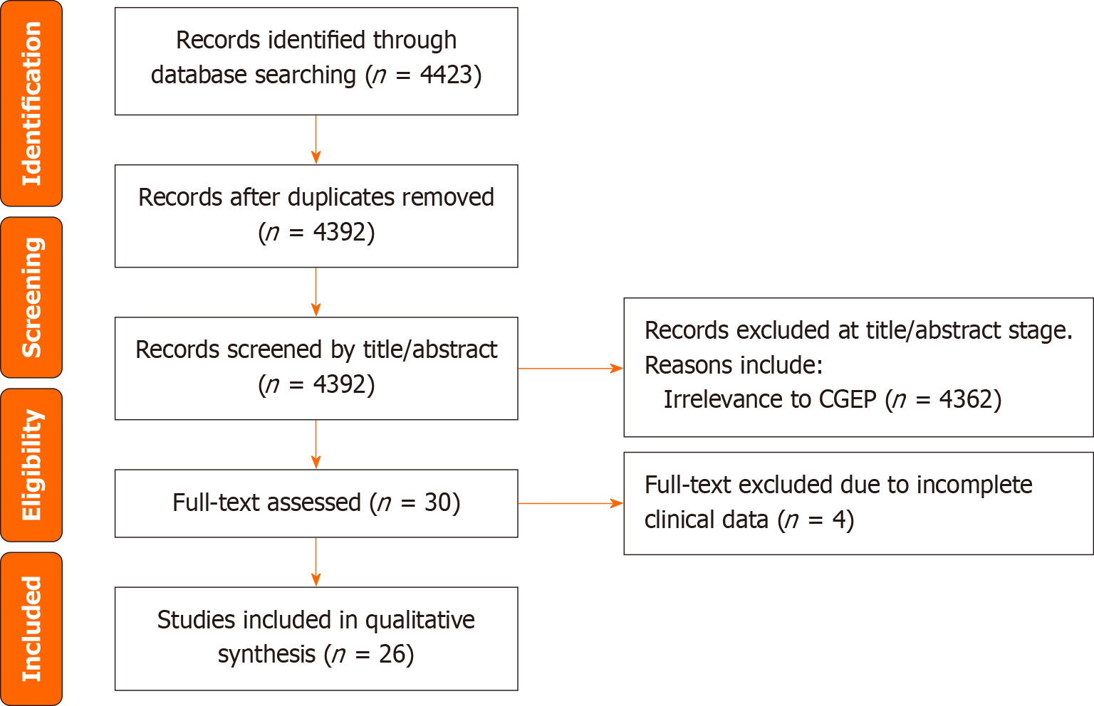 Keywords used in the search included a combination of “pylor”, “ectopi”, “heterotopi”, “abnormality”, “malformation”. The search was restricted to studies in human subjects and published in English or Chinese language in peer-reviewed journals. Inclusion criteria were as follows: (1) Studies providing detailed clinical data including patient demographics, clinical manifestations, diagnostic methods and treatment strategies; and (2) Publications in English or Chinese language with full-text availability. Exclusion criteria included: (1) Duplicate publications reporting the same patient cohort; and (2) Studies with insufficient clinical information to confirm diagnosis. Two authors (Wang C and Zhai YQ) independently screened the titles and/or abstracts, and reviewed the full-text articles for eligibility. Any discrepancy in article selection was resolved by consensus and in discussion with another co-author. Additionally, references in the included articles were also manually reviewed to identify potentially suitable articles. The detailed search strategy is shown in the study flow diagram (Figure 1). We identified 4423 publications, and 26 studies were ultimately included in this review[1-26]. In total, 29 patients with CGEP were included, and their clinical characteristics are summarized in Table 1.