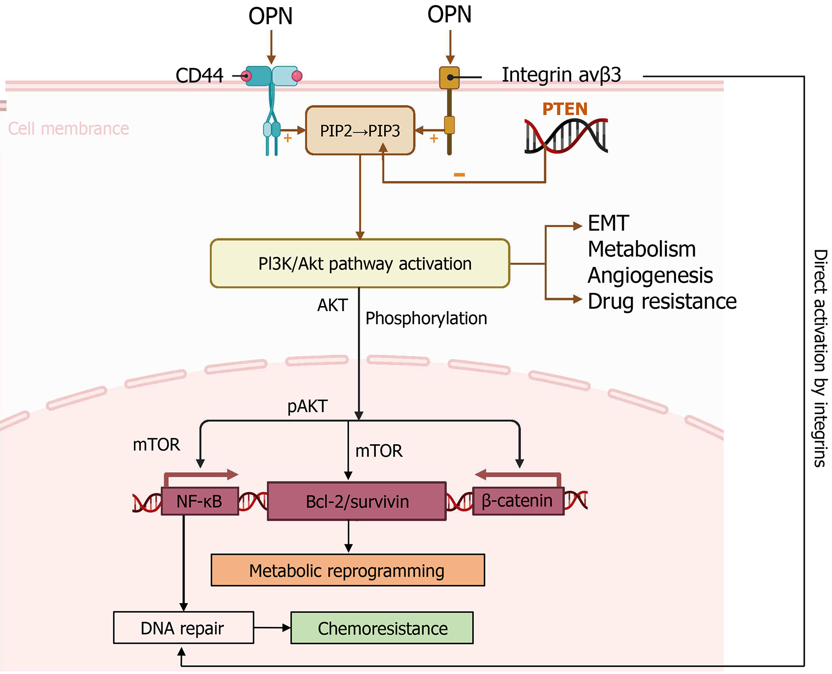 OPN: Osteopontin; CD44: Cluster of differentiation 44; PI3K: Phosphoinositide 3-kinases; PIP2: Phosphatidylinositol-4:5-bisphosphate; PIP3: Phosphatidylinositol-3:4:5-trisphosphate; PTEN: Phosphatase and tensin homolog; AKT: Protein kinase B; mTOR: Mammalian target of rapamycin; NF-κB: Nuclear factor kappa-light-chain-enhancer of activated B cells; EMT: Epithelial-mesenchymal transition.