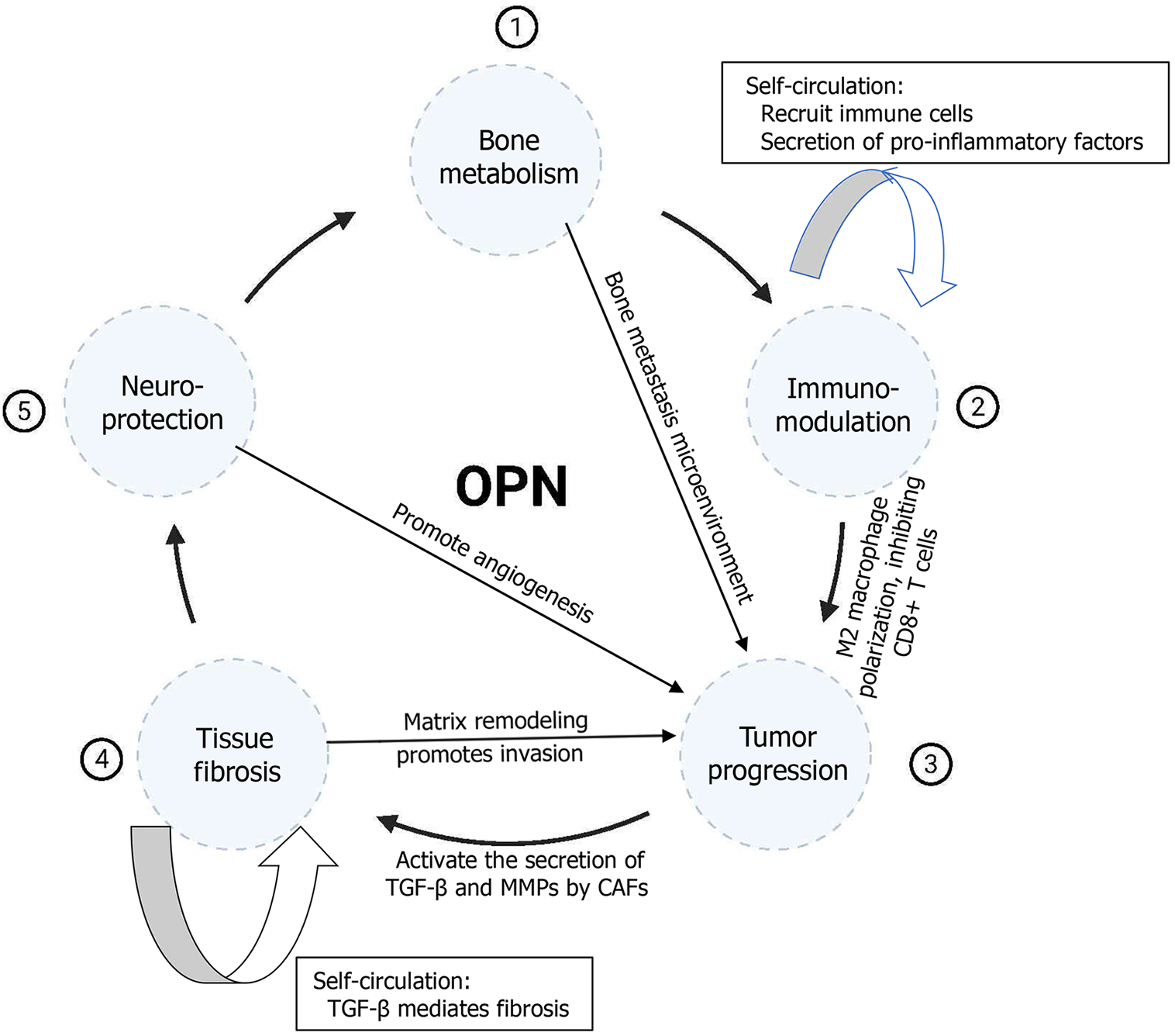OPN: Osteopontin; TGF-β: Transforming growth factor-beta; MMPs: Matrix metalloproteinases; CAFs: Cancer-associated fibroblasts; CD: Cluster of differentiation.
