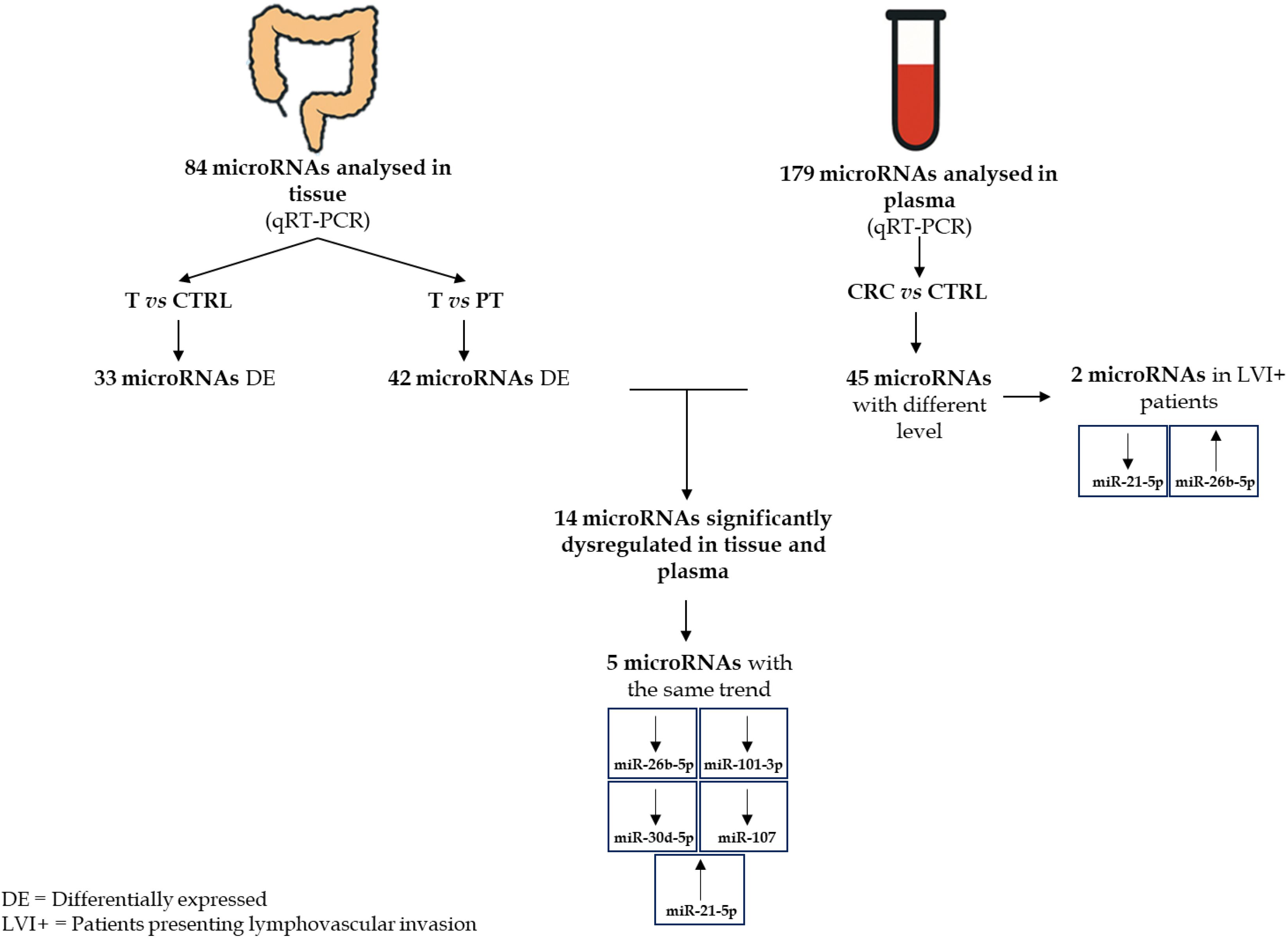 qRT-PCR: Quantitative real-time polymerase chain reaction; T: Tumoral; CTRL: Control; PT: Peritumoral; DE: Differentially expressed; CRC: Colorectal cancer; LVI: Lymphovascular invasion.