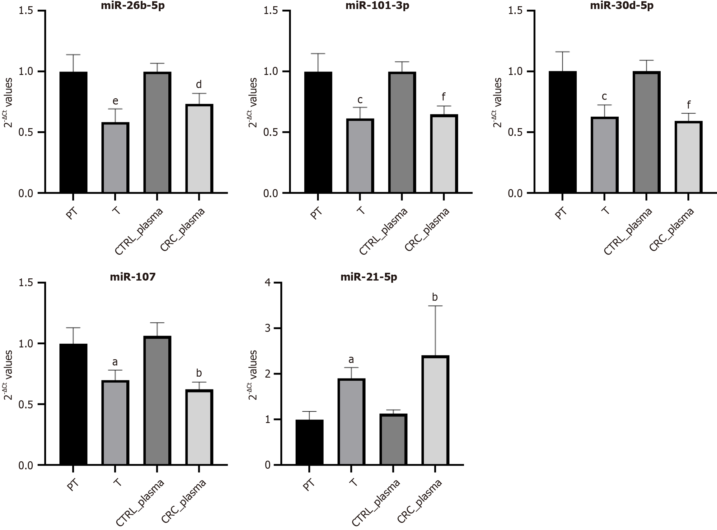 Bar graphs represent the fold change values, and error bars represent the standard error of the mean. Statistical significance was calculated using the Wilcoxon signed-rank test in tumoral vs peritumoral analysis, and the Mann-Whitney test in colorectal cancer plasma vs control plasma analysis. T: Tumoral; CTRL: Control; PT: Peritumoral; CRC: Colorectal cancer. aP < 0.05 vs peritumoral, bP < 0.05 vs control plasma, cP < 0.01 vs peritumoral, dP < 0.01 vs control plasma, eP < 0.001 vs peritumoral, and fP < 0.001 vs control plasma.