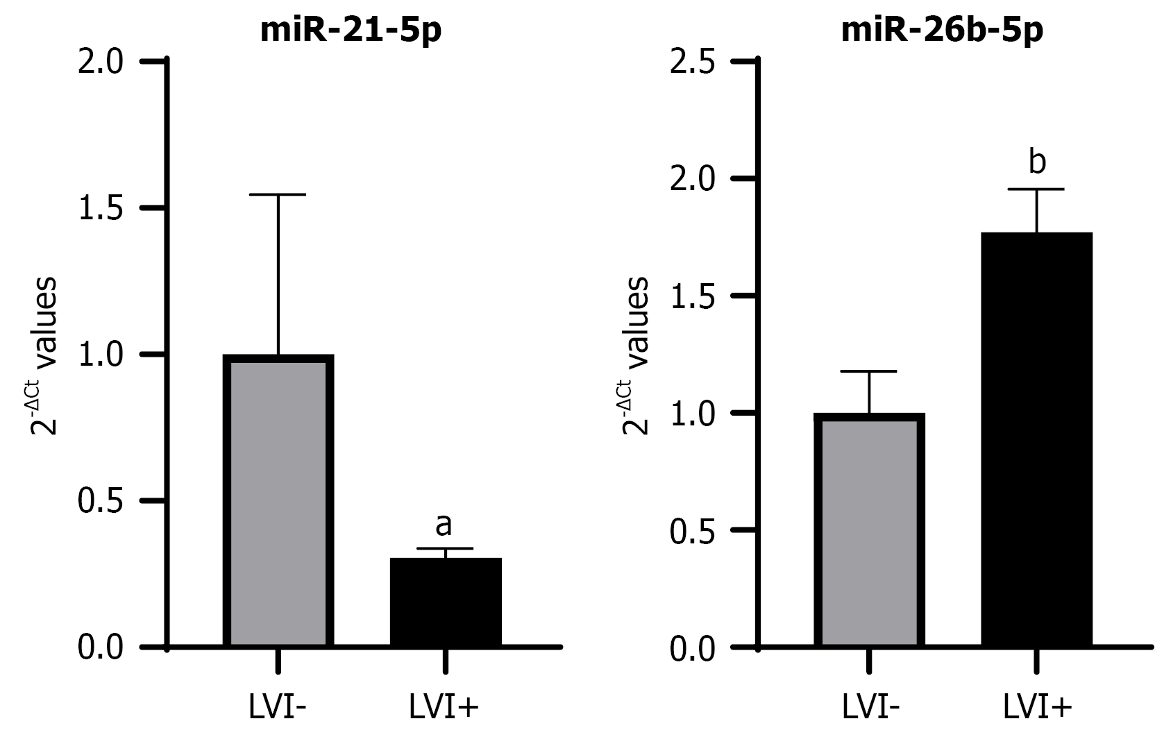 Figure 3 Levels of miR-21-5p and miR-26b-5p in plasma from patients with lymphovascular invasion (lymphovascular invasion+) vs non-vascular invasion (lymphovascular invasion-).
